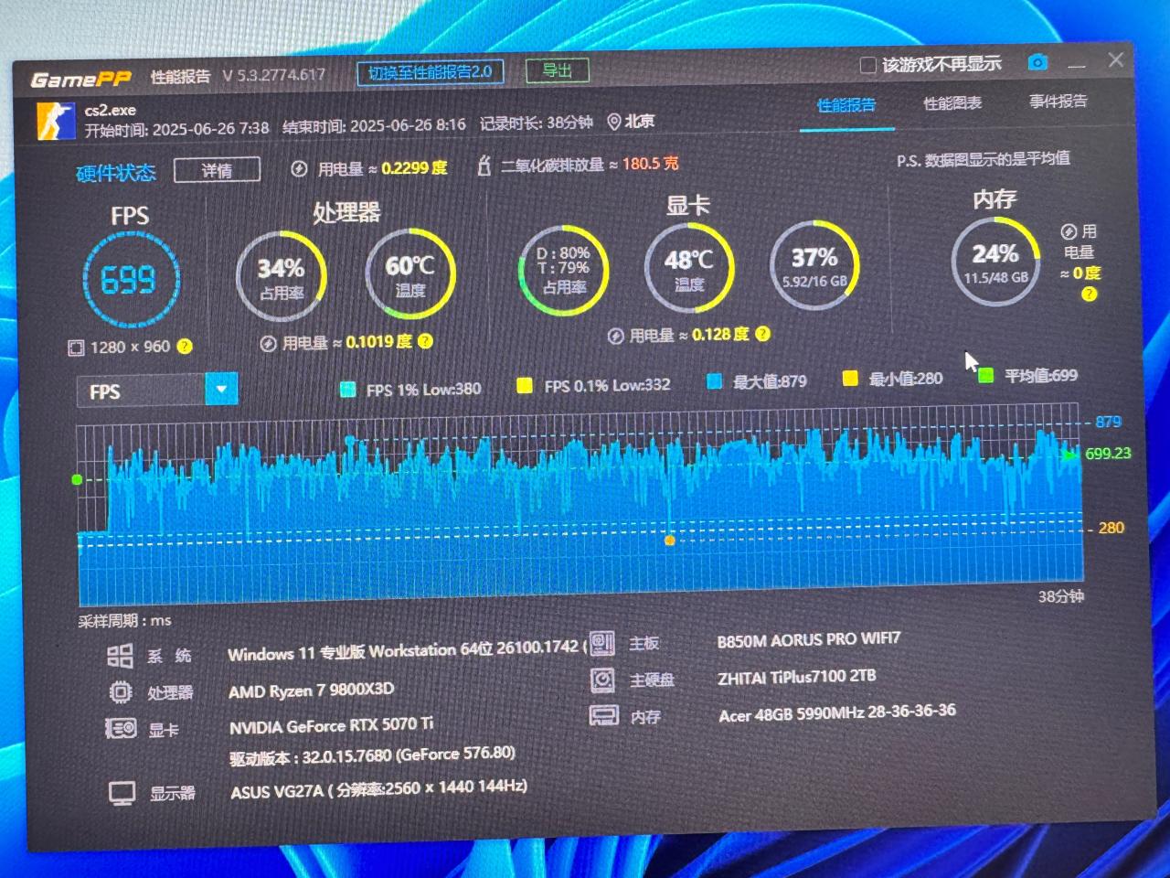 平均FPS 700左右,1% Low 高达380 FPS,0.1% Low也高达332 FPS ,可以看到,前几分钟是锁的400FPS的情况下测试的,再加上开着游戏加加的情况下,如果用小飞机会更高。