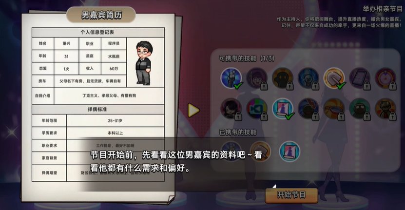 而玩法也没有太脱离游戏本体,玩家作为主持人会先拿到男嘉宾的档案,这里和在相亲会所是一样的,需要根据他的个人信息去帮忙打圆场,应对女嘉宾的提问。