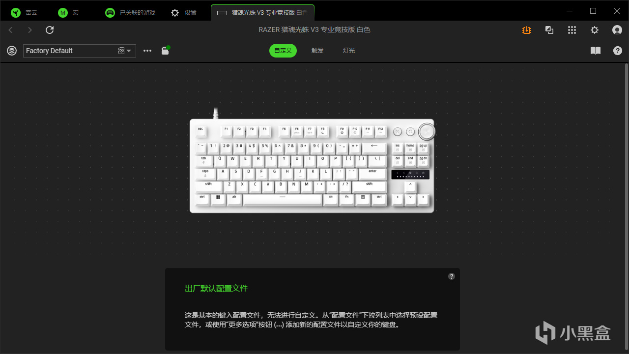 来到上机测试方面,雷蛇的灯光永远是值得表扬的地方。键盘有最多1680万种颜色和独特灯效可以进行选择,通过雷云我们甚至还可以和我们游玩的大部分游戏进行联动。外观体验是直接拉满的,让你成为场上最炫酷的那个人。另外现在的雷云的功能已经十分的完善,通过雷云我们可以对键盘进行更加细致的调整。而且雷云还有新手教程可以手把手叫你调教键盘。