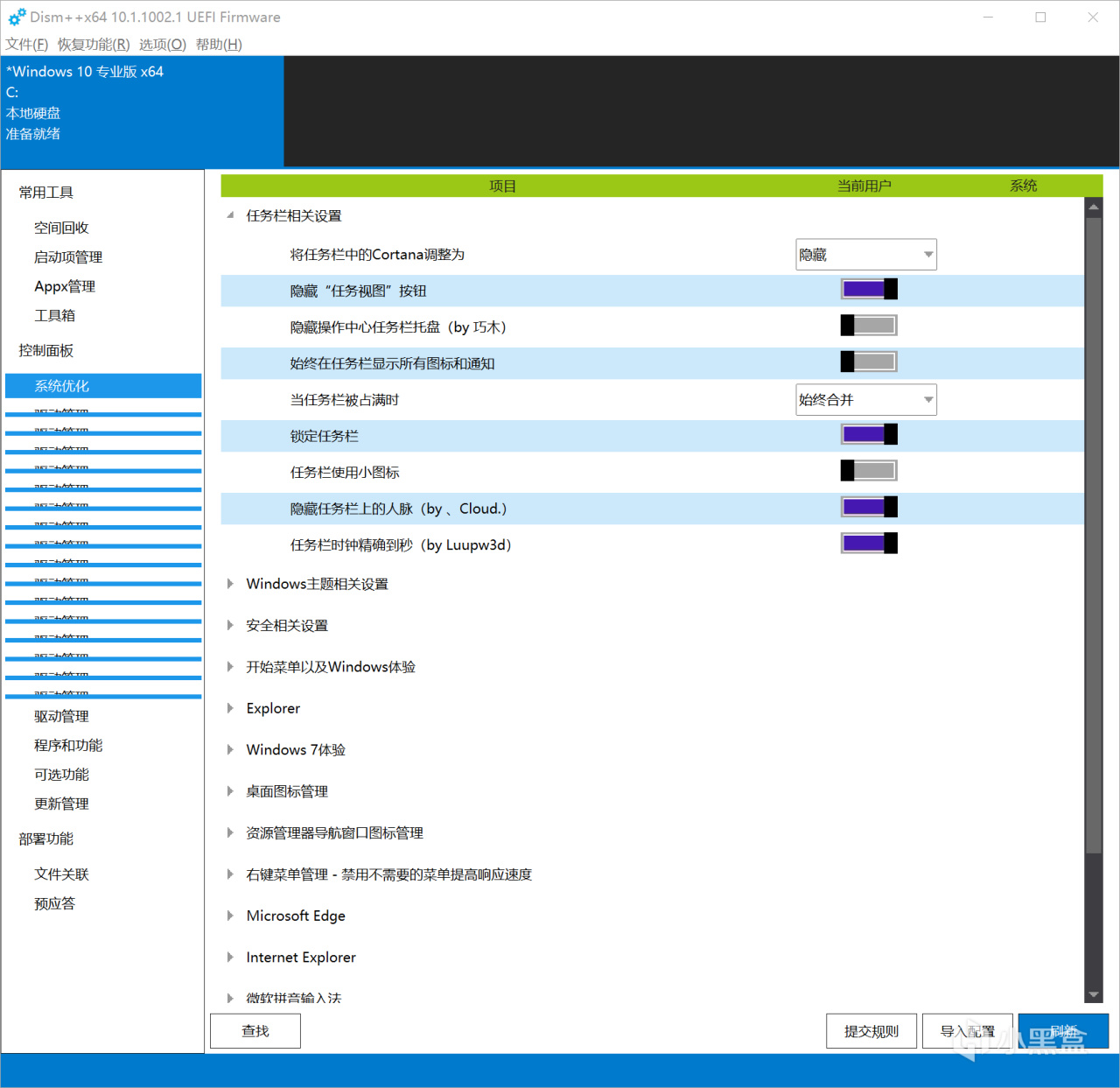 系統上一些小功能的設置可以使用Dism++這個工具來進行設置,軟件上不能進行設置的,可以通過系統自帶的設置或者控制面板進行設置(比如鎖屏界面上的應用)