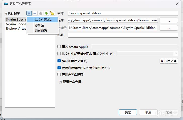 下載好SKSE後將其解壓至天際的遊戲根目錄下即可。解壓好後在MO2的右上點開可執行程序的編輯,選擇從文件添加並將SKSE64_Loader.exe添加爲可執行程序後確定。