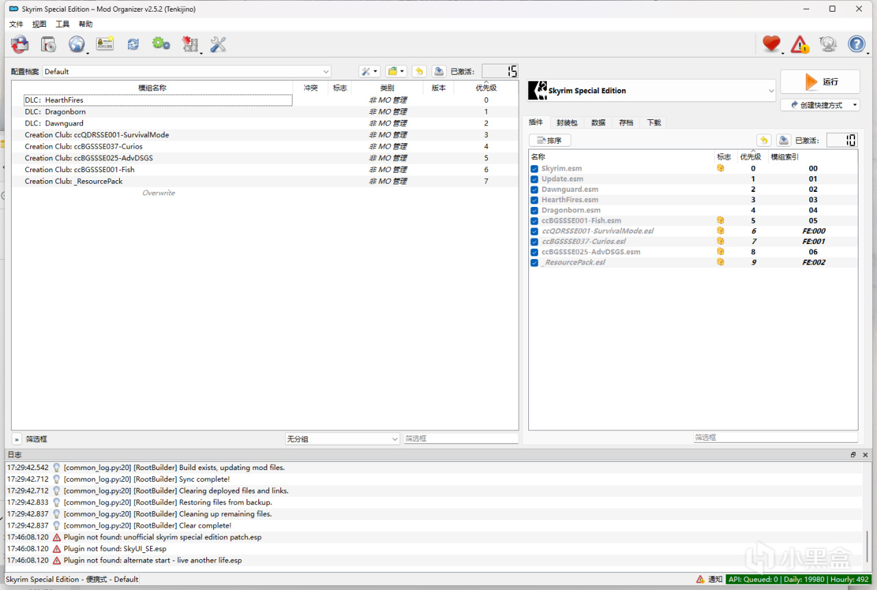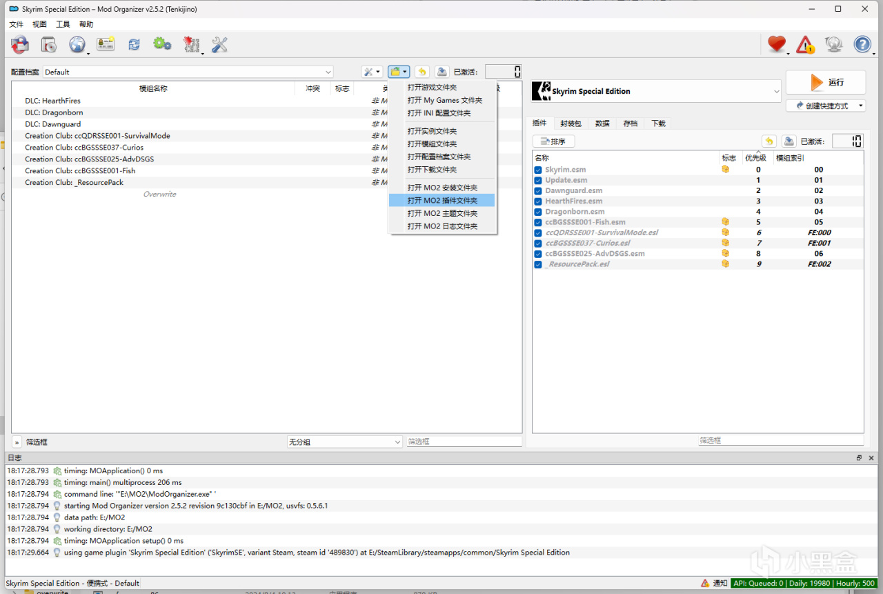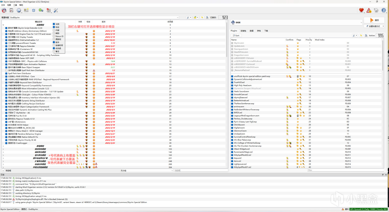 左上的配置檔案允許你建立不同的檔案來管理不同的模組加載列表,這篇文章中不太需要使用到這項功能,配置檔案下面也就是畫面左側的大框爲你所安裝的模組,最上面的這一部分是天際本身自帶的內容因此不受MO管理,Overwirte爲遊戲運行過程中產生的額外配置文件緩存等,它們會在遊戲結束運行後自動遷入此文件夾內。右側的運行則是啓動對應的程序,這裏默認是天際的主程序,下面的大框爲天際的各插件