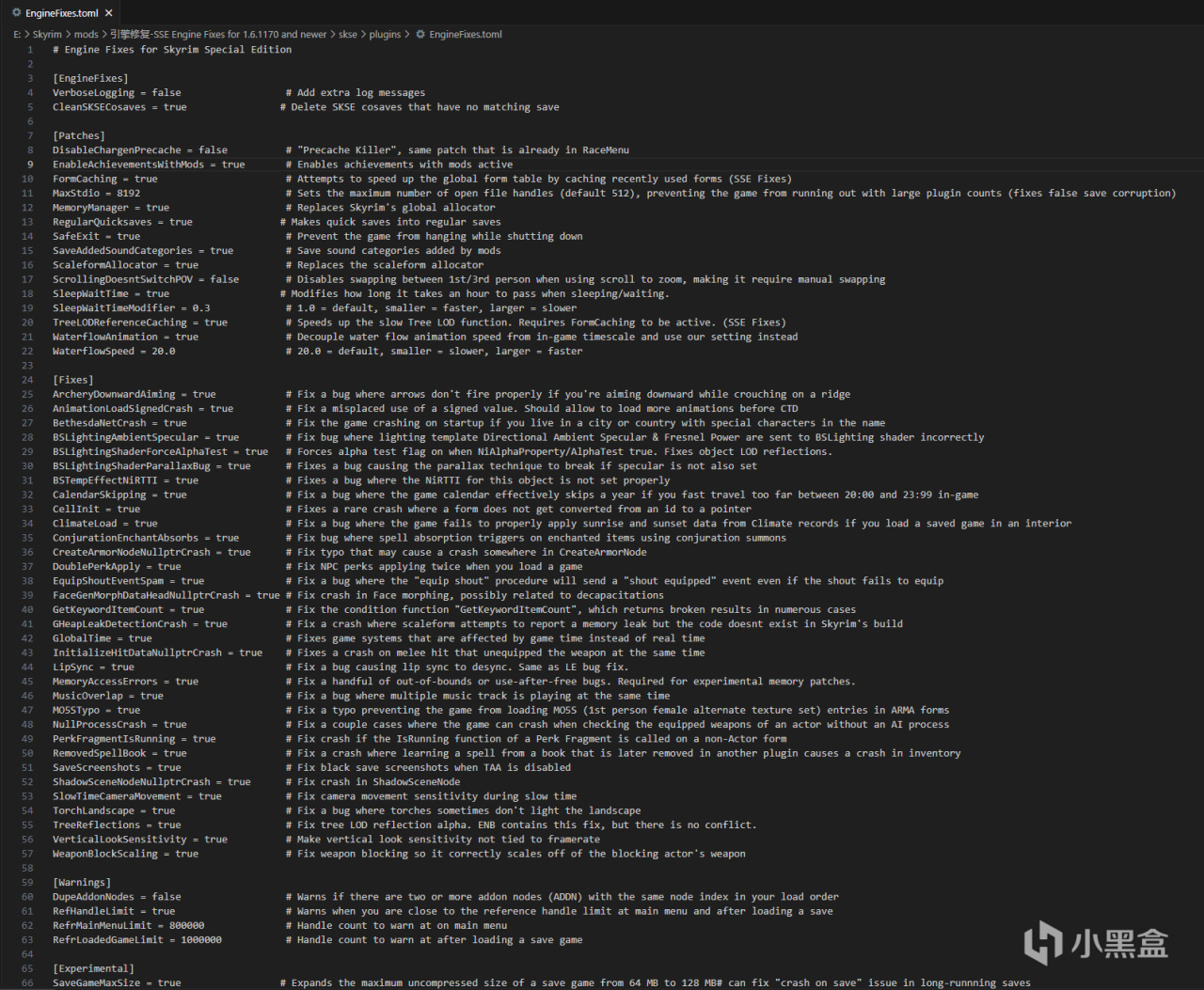 引擎修復存在一個可配置文件,名爲EngineFixes.toml,可以參考我的文件配置進行設置。每個配置的含義後面皆自帶英文批註,看不懂還請善用機翻。