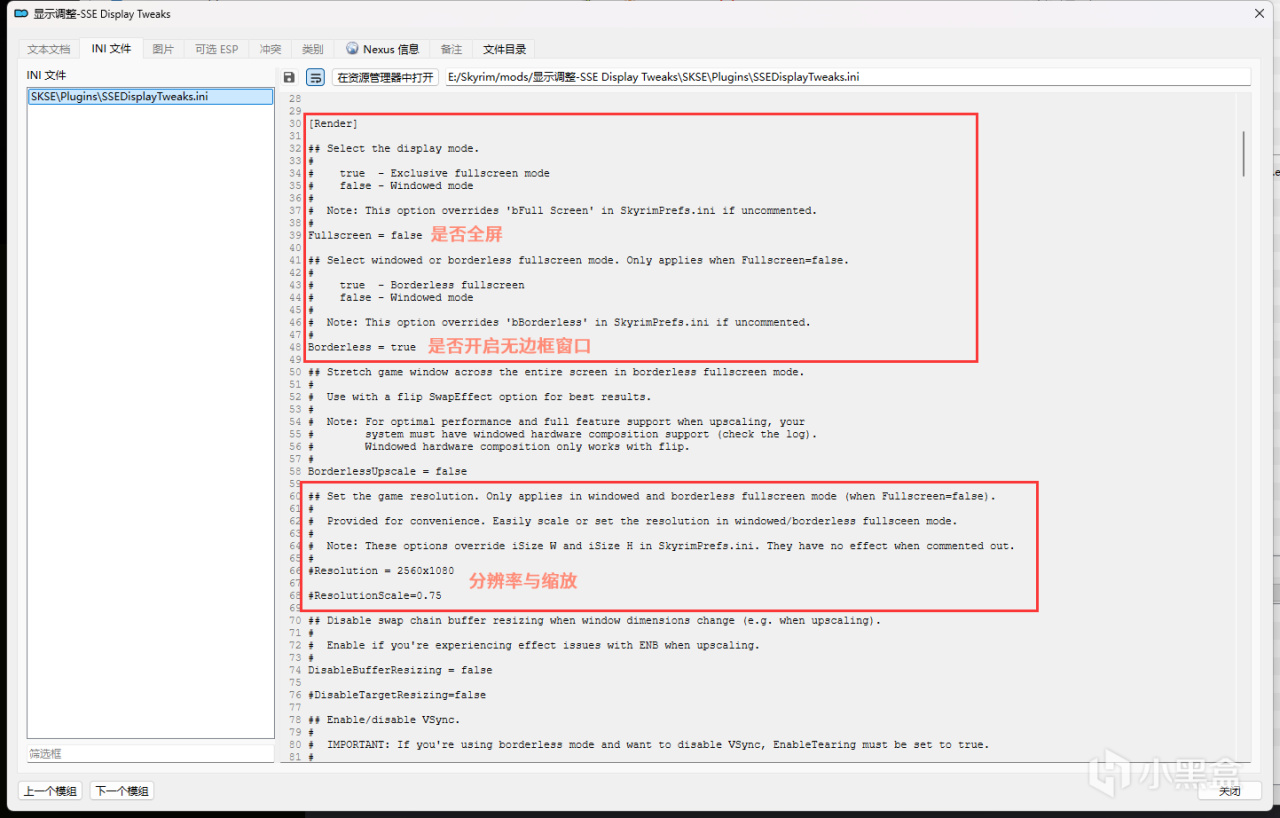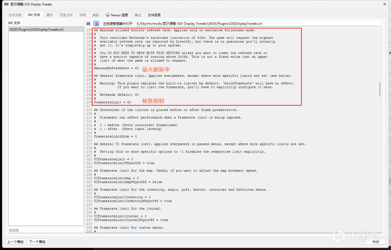 顯示調整,天際的引擎因爲其古老有一個弊病便是如果幀數超過了60便會發生不可預知的物理錯誤,比如遊戲開局時發生馬車飛天或是翻車等。此模組解決了這一痛點問題,其自帶一個配置文件可在其中調整遊戲分辨率,全屏,無邊框全屏以及幀數上限等,安裝好後在MO2內雙擊模組可以看到ini文件,相關配置都在其中,常用的配置主要爲這幾項。對於需要啓用的配置如果前面帶有#則需要把#刪去