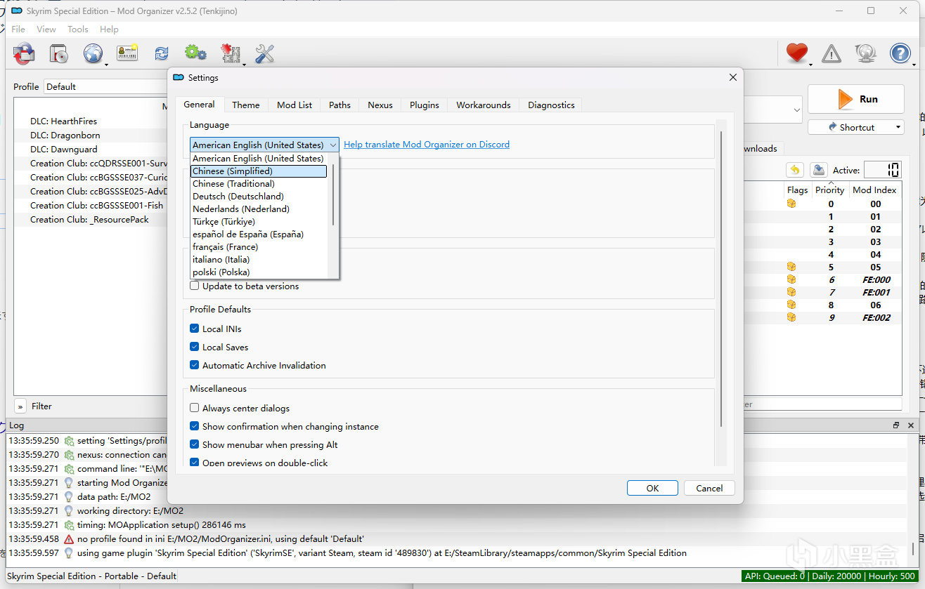 完成後會自動啓動MO2,第一次啓動可能會詢問你是否要連接Nexus賬戶,根據自己的需要來鏈接即可,啓動好後點擊頁面上的扳手螺絲刀圖標進入設置,這裏可以把語言設置爲簡體中文。