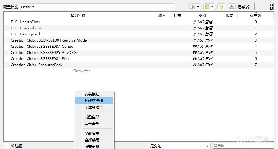 但如果你想像我一樣使用了我所推薦的Root Builder插件,那麼就不需要將它解壓至根目錄而是像我這樣操作,在MO2頁面的左側右鍵建立一個空模組,取名隨意,我個人的命名習慣是“模組中文名-英文原名”。