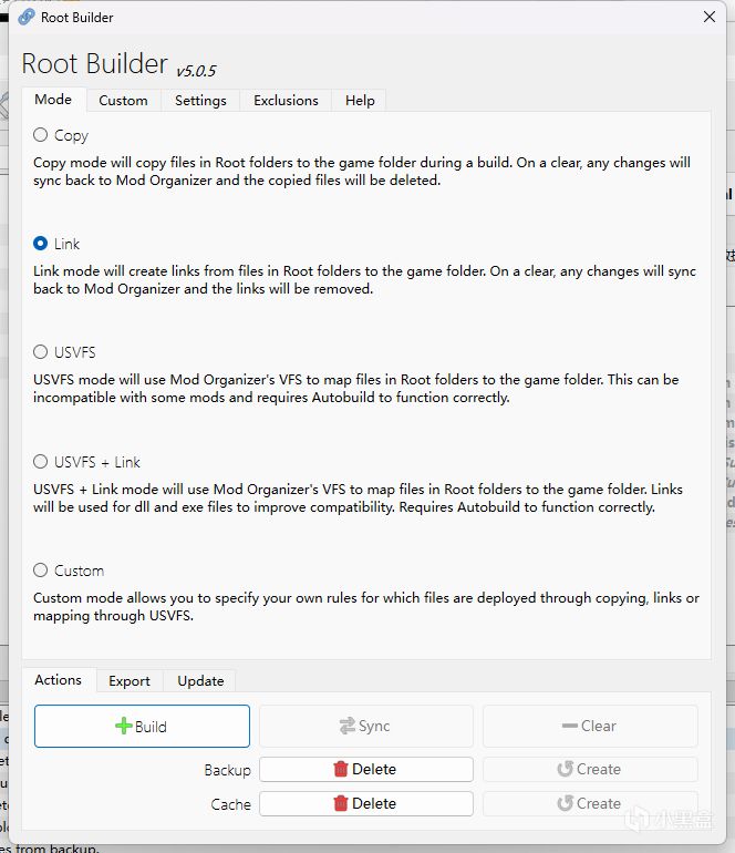 但在此之前再推薦一個MO2插件Root Builder(N網尾號:31720),此插件可以基本上實現將任何需要放置於遊戲本體根目錄的內容也交予 MO2進行管理,以此來保持遊戲本體的純淨性。下載好後從圖中此處打開MO2插件文件夾,將下載好的Root Builder解壓於此後重啓MO2即可。重啓好後可於圖中位置點開Root Builder頁面,我個人選擇Link模式,隨後進行一次Build再Clear讓插件建立第一次的緩存,之後便可正常使用了。