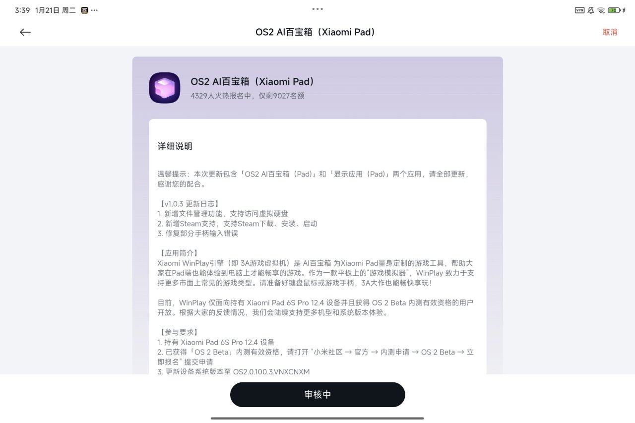 雷總在平板上虛擬了個能上Steam的Win系統,在這個系統裏裝上了Steam。功能發佈在OS2的AI工具箱裏。下載小米社區APP領取。