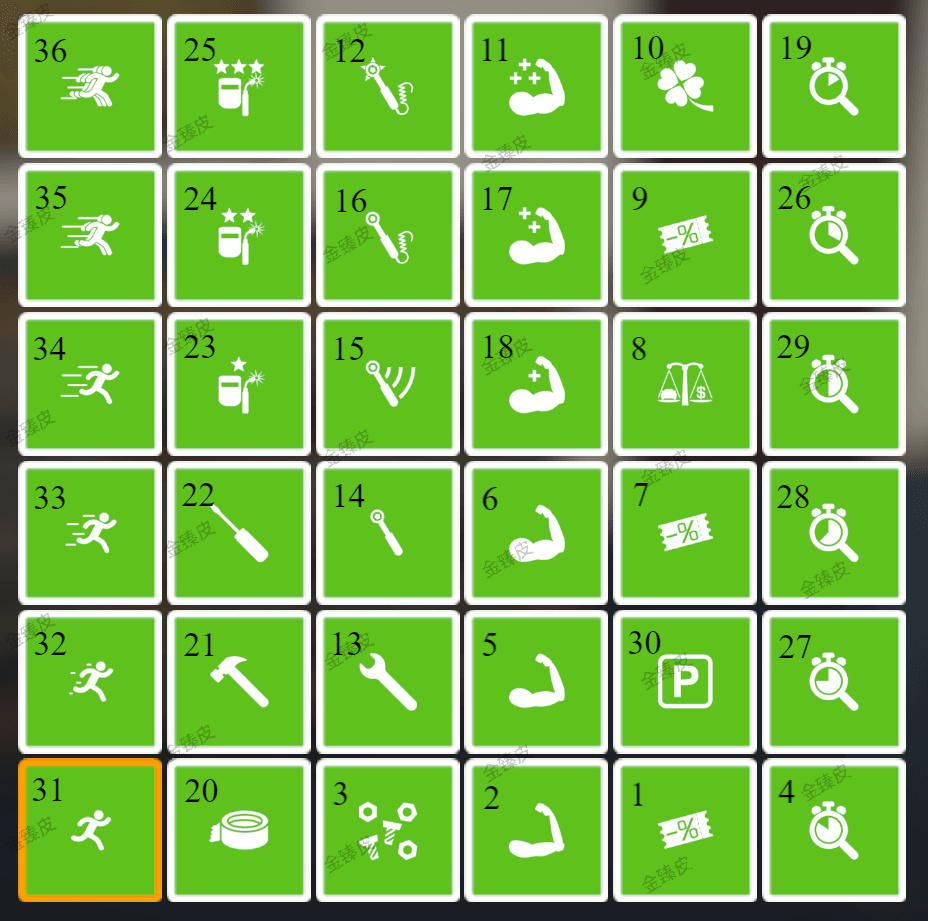 原理:任意位置+1,其他两个位置都会-1,最终目标是5个位置全部+6,动力达到+16%最大提升。