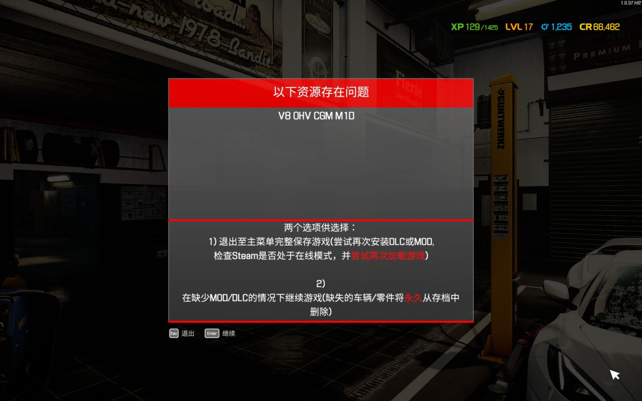 创意工坊导致的报错如下图,原因为订阅了并在游戏中购买了某些需要dlc的车,缺少相应零件,解决方法是将对应车卖了即可。