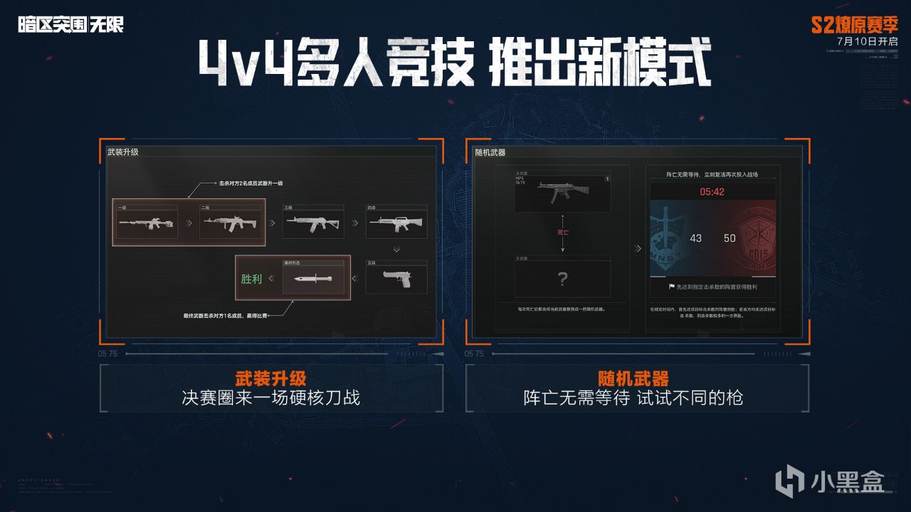 独狼模式将在新赛季常驻;双排模式于农场与北山两张地图交替开放;4v4多人竞技推出全新模式,武装升级、随机武器等你来战。