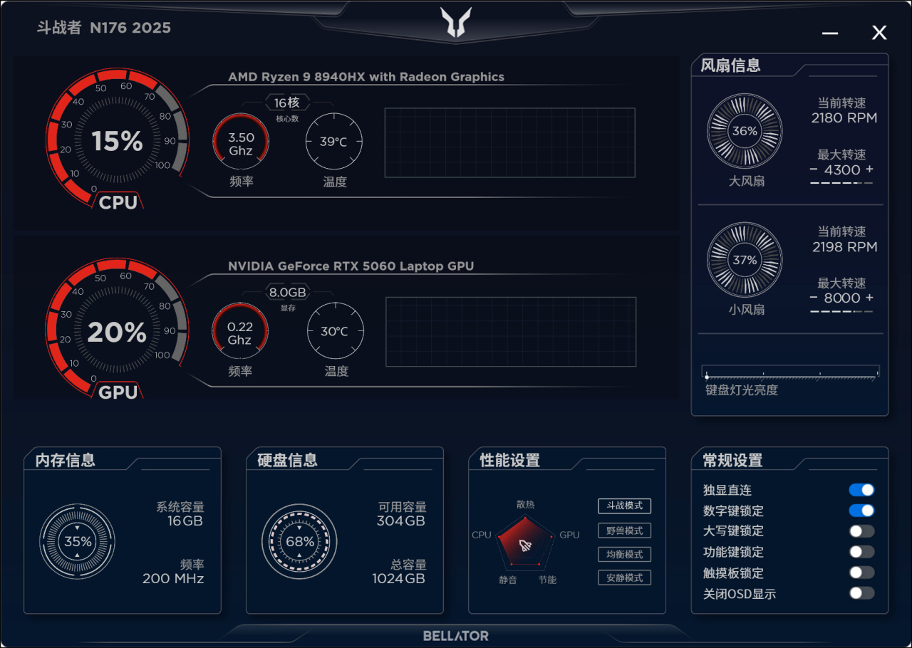 斗战者的控制台相当简洁,能操作的只有性能设置,常规设置这两块。