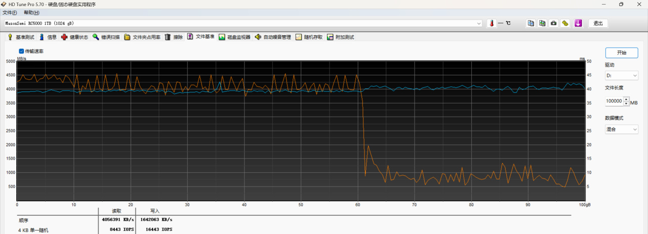 测试100G混合模式,在60G出缓存,缓外速度掉到1000以下,依然有水平,一看就是二线的物料。