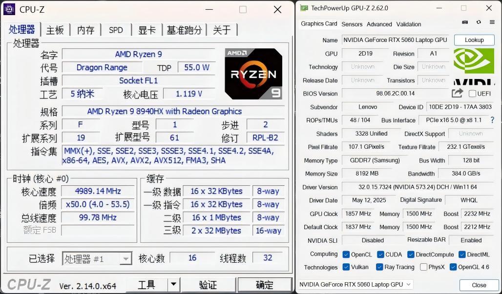 CPU为R9 8940HX,N-1方案,有16颗大核心32线程,多核性能非常强,80MB缓存和5.3g睿频。
