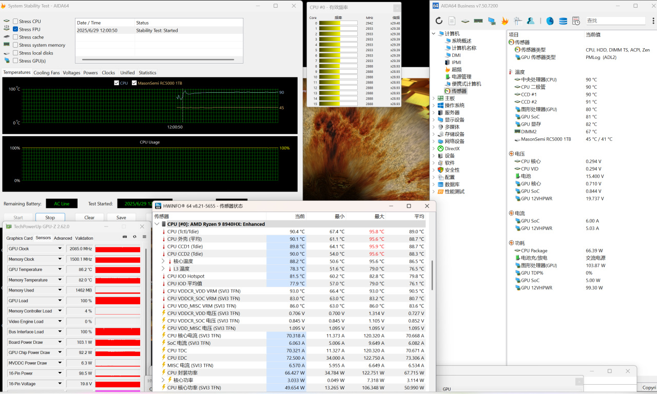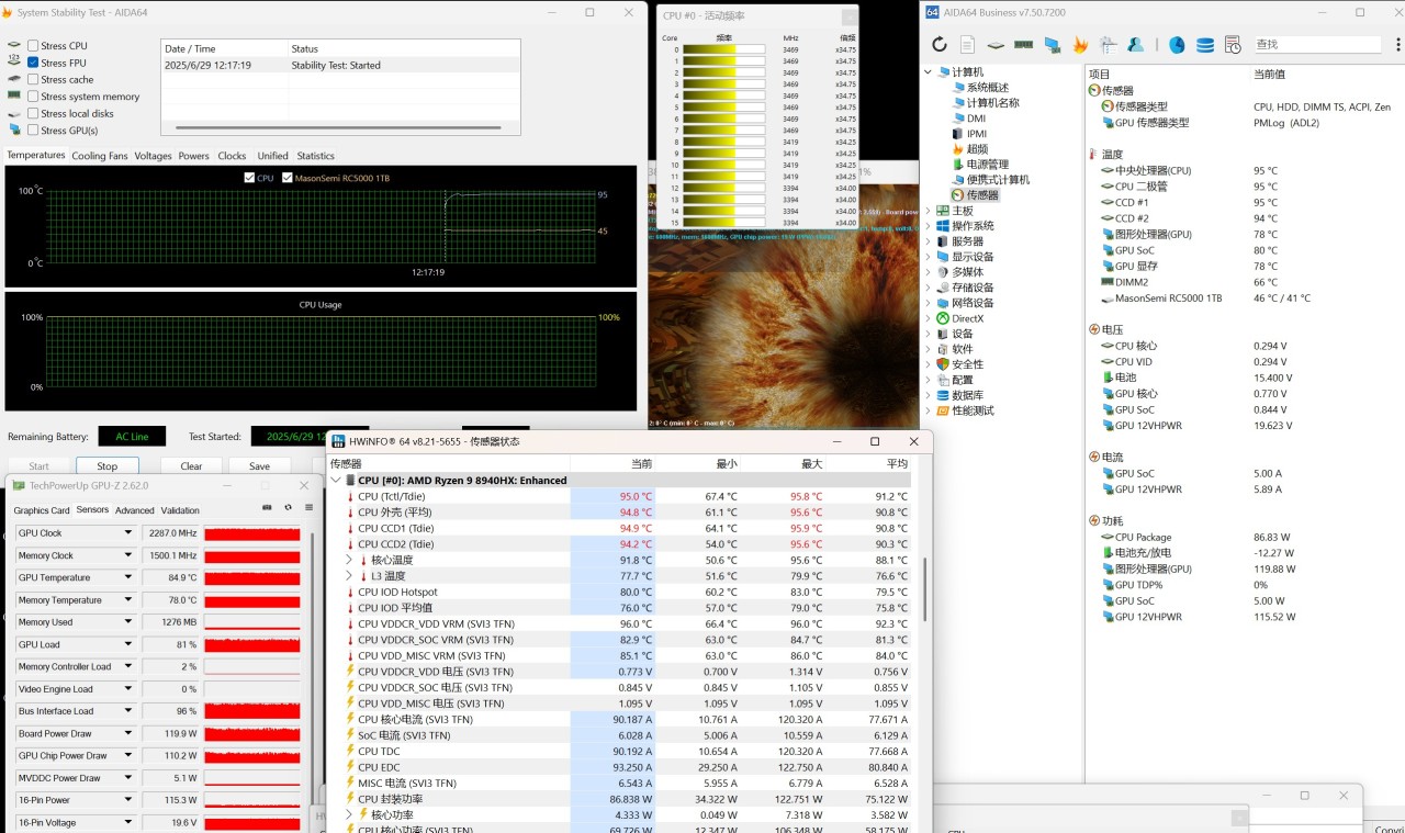 斗战模式,更极限,从电池取电CPU功耗86W,显卡功耗119W,合计205W,着实是猛。