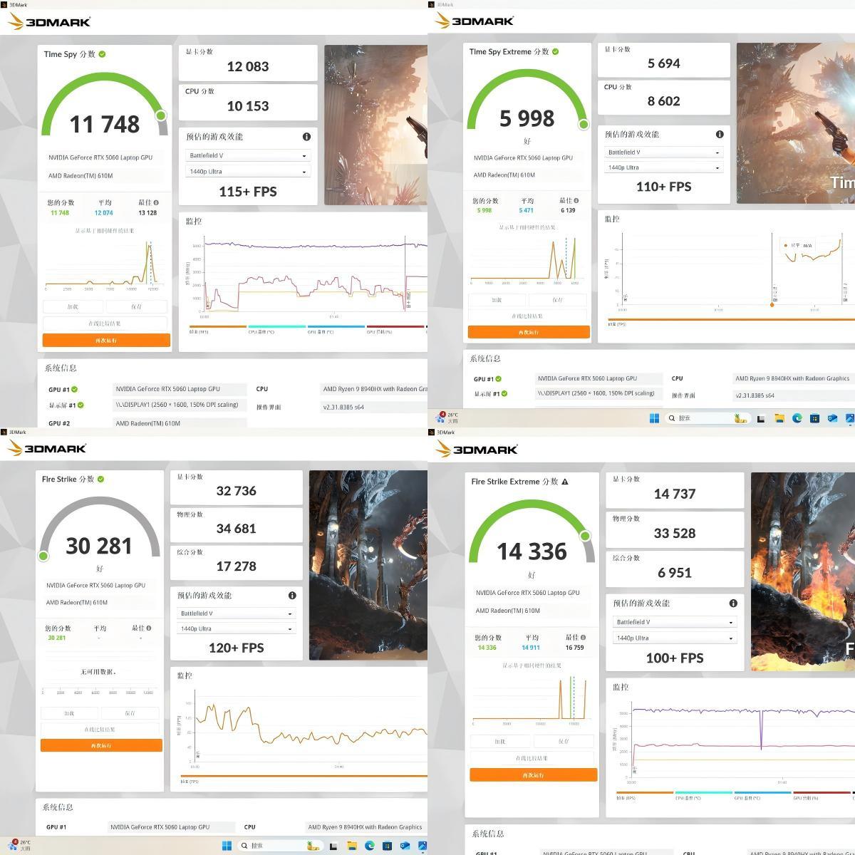 TimeSpy整体分数为11748分,显卡分数为12083分,对比上代4060提升约15%~20%,相当之大。CPU分数为10153分,能过10000分已经很不错了。