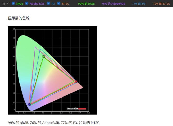 实测99%sRGB,76%AdobeRGB,77%P3色域,72%NTSC色域。