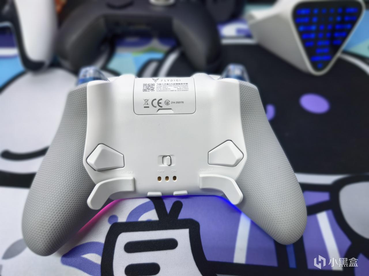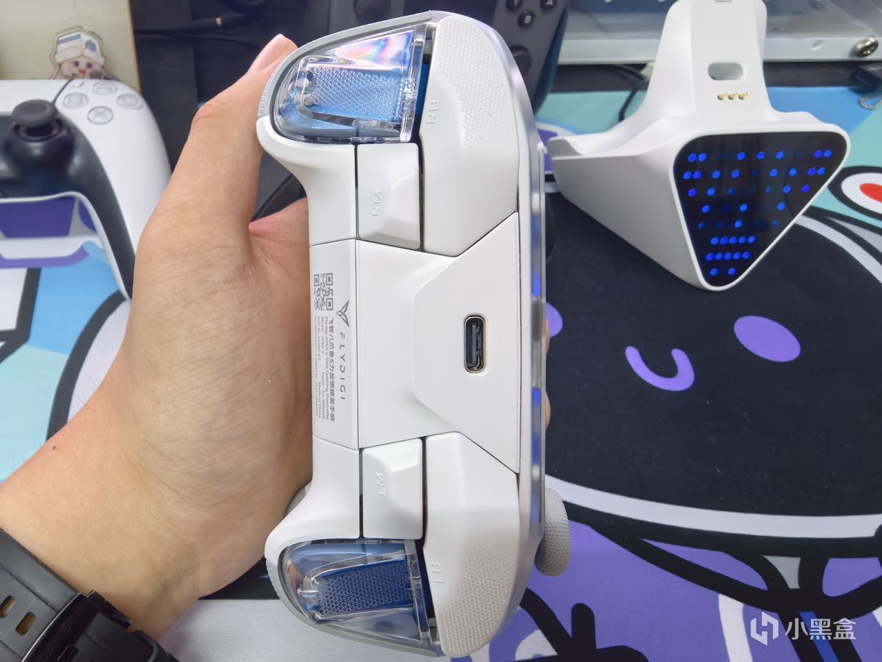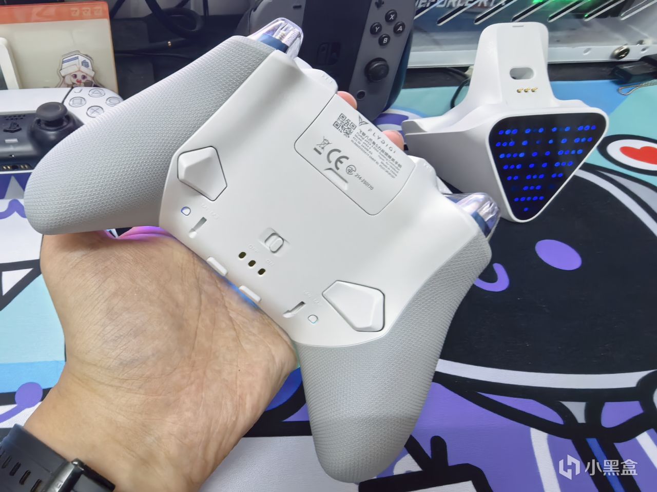 背面的改动可以说是和84是完全不同的两个手柄了,85的背面承受了太多,原先顶部的支架槽、底部的充电触点、正面的FN与tuber键全都来到了背面,背键的外形也进行了重构。虽然去东西变多了,但是支架槽默认隐藏,新加入的功能也都集中在背面下半部分视觉上并不会杂乱。