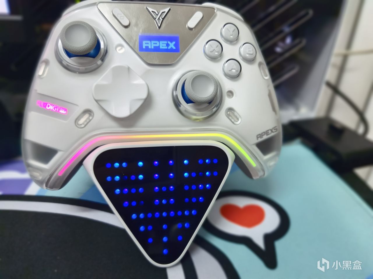 底座和84底座比确实是涨价100块,不过先不要急着喷,这次的底座可不是一般的底座,正面有支持最高150帧的点阵彩屏,可以在飞智空间站里使用官方预设的动画,或者上传自己/网游制作的图案,飞智这是把桌搭进行到底了,配合手柄的光效放在桌子上就很好看。
