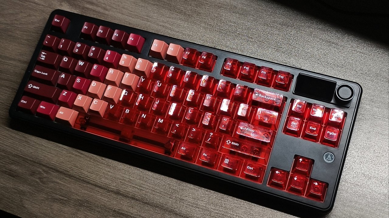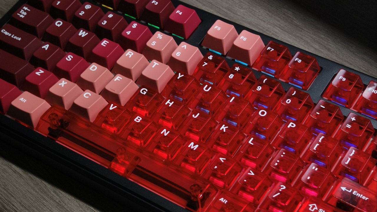 鍵帽方面不同配色材質不同,我手中的是赤焰紅,這款鍵帽是PBT和PC兩種材質雙拼的,整體是紅色像透明鍵帽慢慢漸變過去,我感覺顏值還挺高的