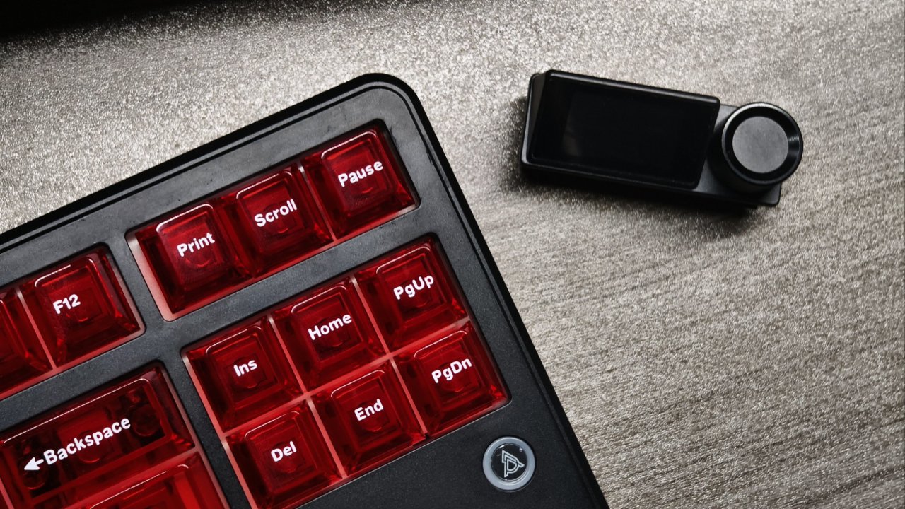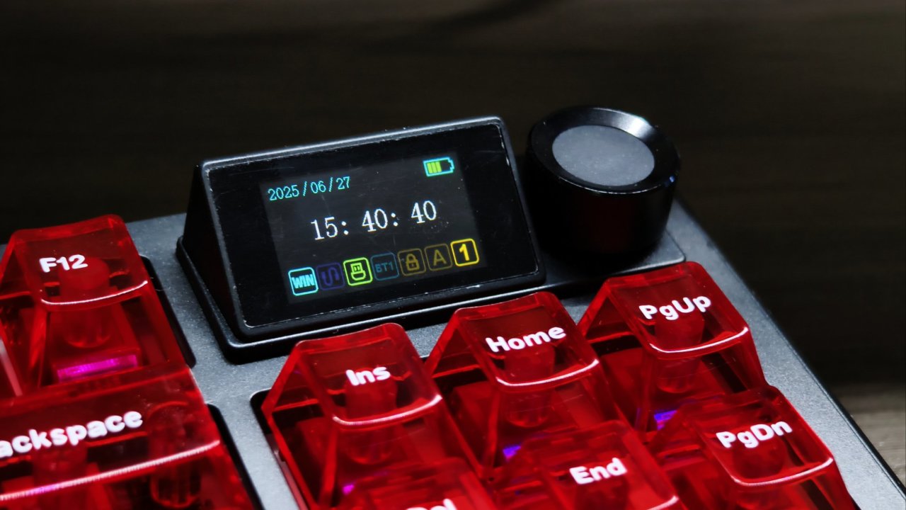 當然如果只看到這些,你可能最多以爲只是改了屏幕的角度而已,實則不然。大家應該還記着我在配件那裏說了他送了三個替換件帽和三個替換軸體,之所以送這些,是因爲這個屏幕是可支持插拔的,如果你真的不太喜歡屏幕,也可以把屏幕拔下來替換上這三顆鍵帽和軸體,我認爲整體的一個可玩性還是蠻高的