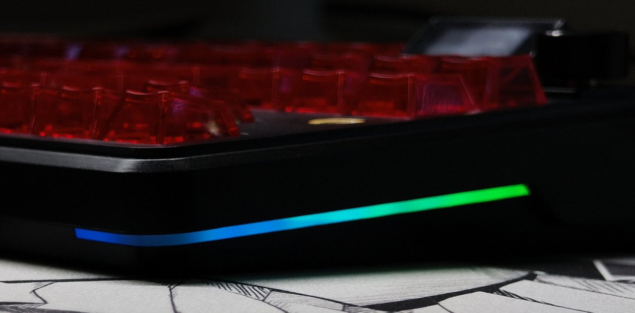 OK後面我們把目光移到鍵盤的側面,你可以發現兩邊都帶有一個RGB燈帶,結合正面的透明鍵帽。我認爲黑爵他家對於燈光還是蠻重視的,顏值很高,非常非常適合那些喜歡燈光喜歡氛圍感的用戶