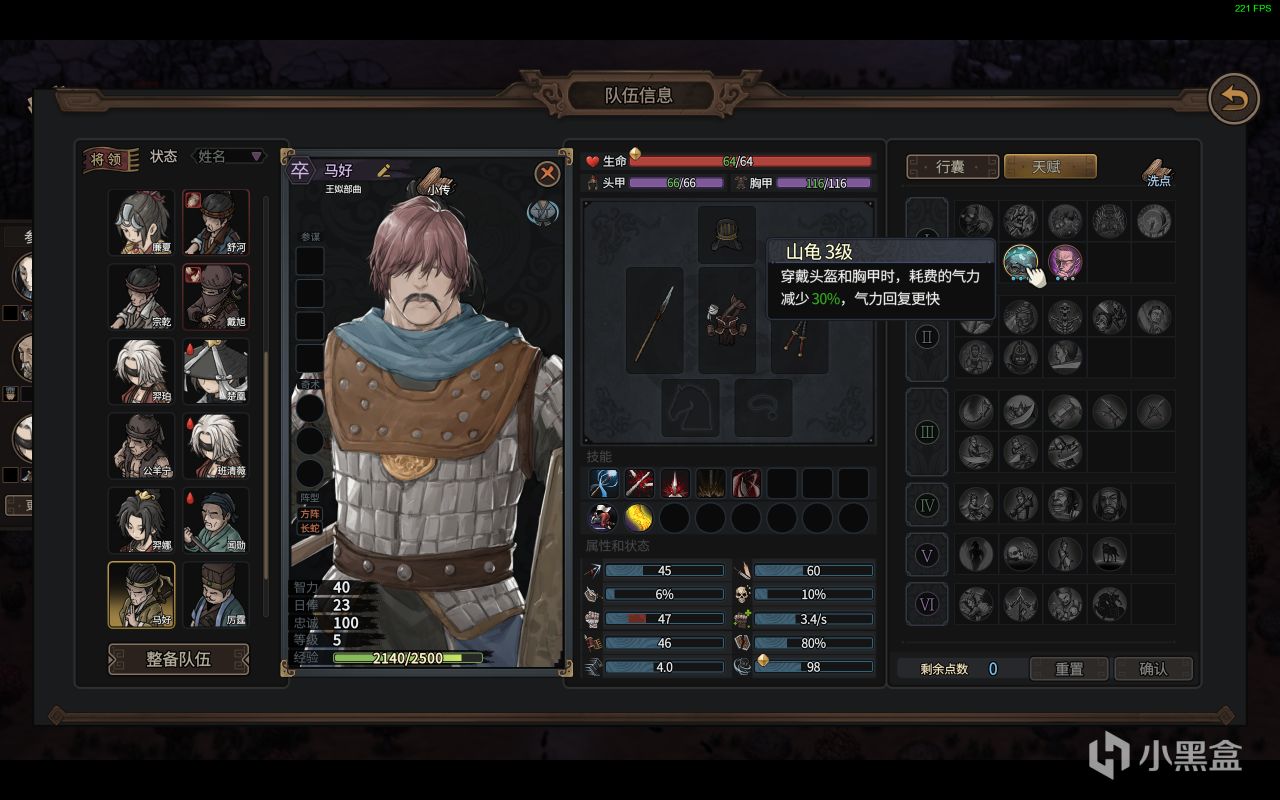 如图,不管是什么将领,优先加“山龟”“吐纳法”“力战不竭”这些关于加“气力”的天赋。这样在战斗中他们的攻击频率才会更高。