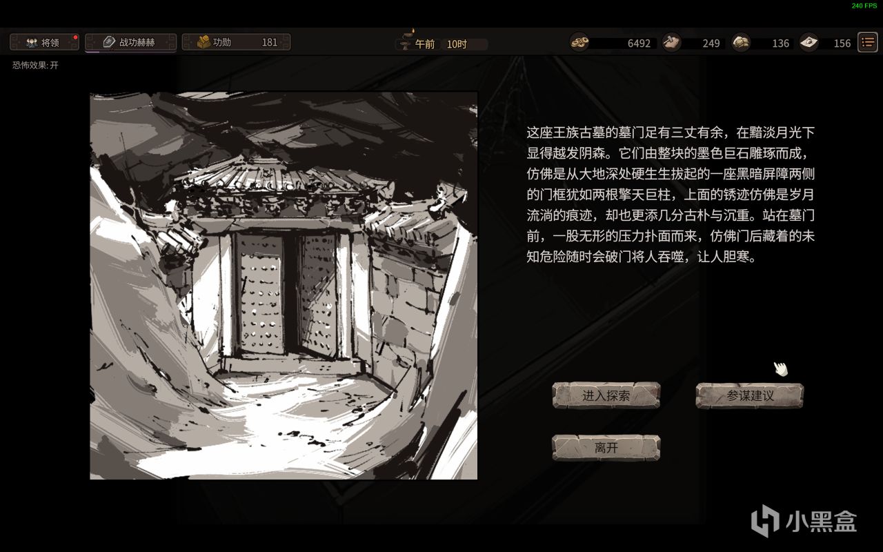 但是每次摸金我个人建议只摸一个就跑。因为盗墓部分是一条路走下去的,中间不会出现什么岔路,只有“前进”“探索”“离开”等基础选项。而越到后面,出现敌人和神秘生物的概率就越大(别管为什么墓里还有这么多人藏着),而且在里面是只能消耗资材和伤药来恢复状态的,效率非常低。