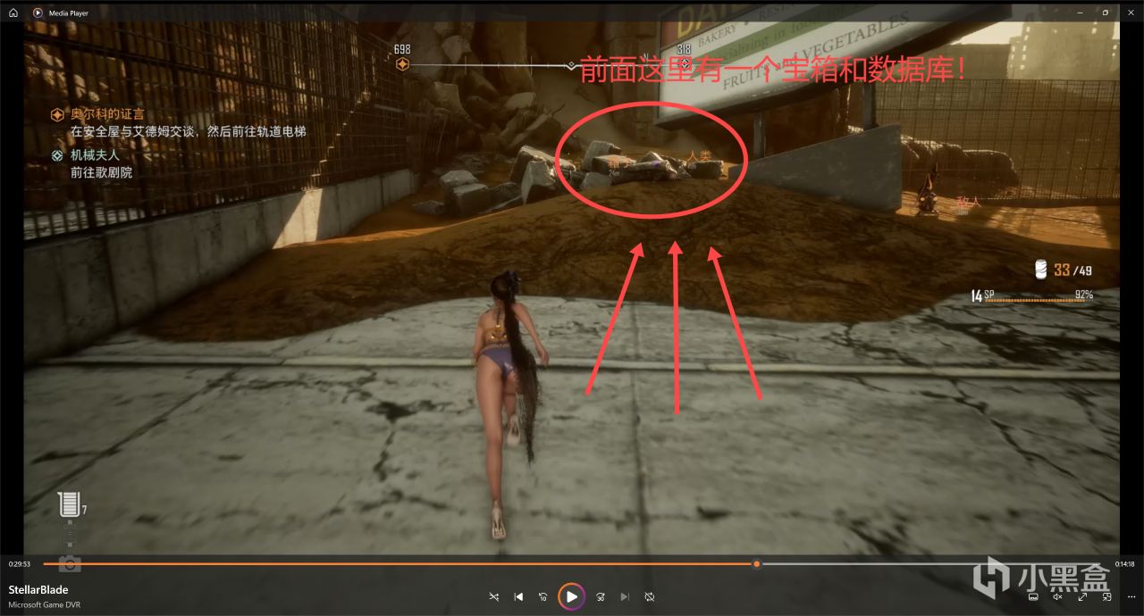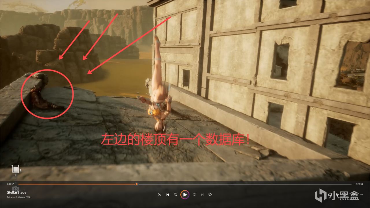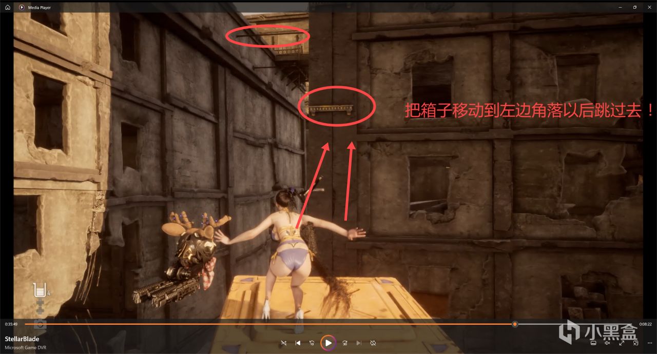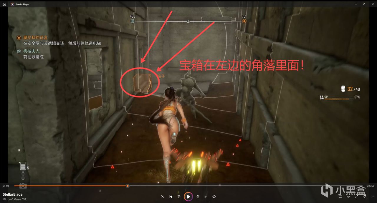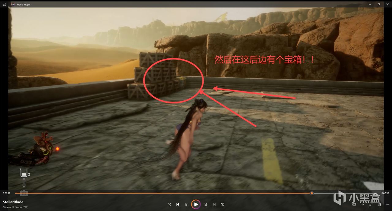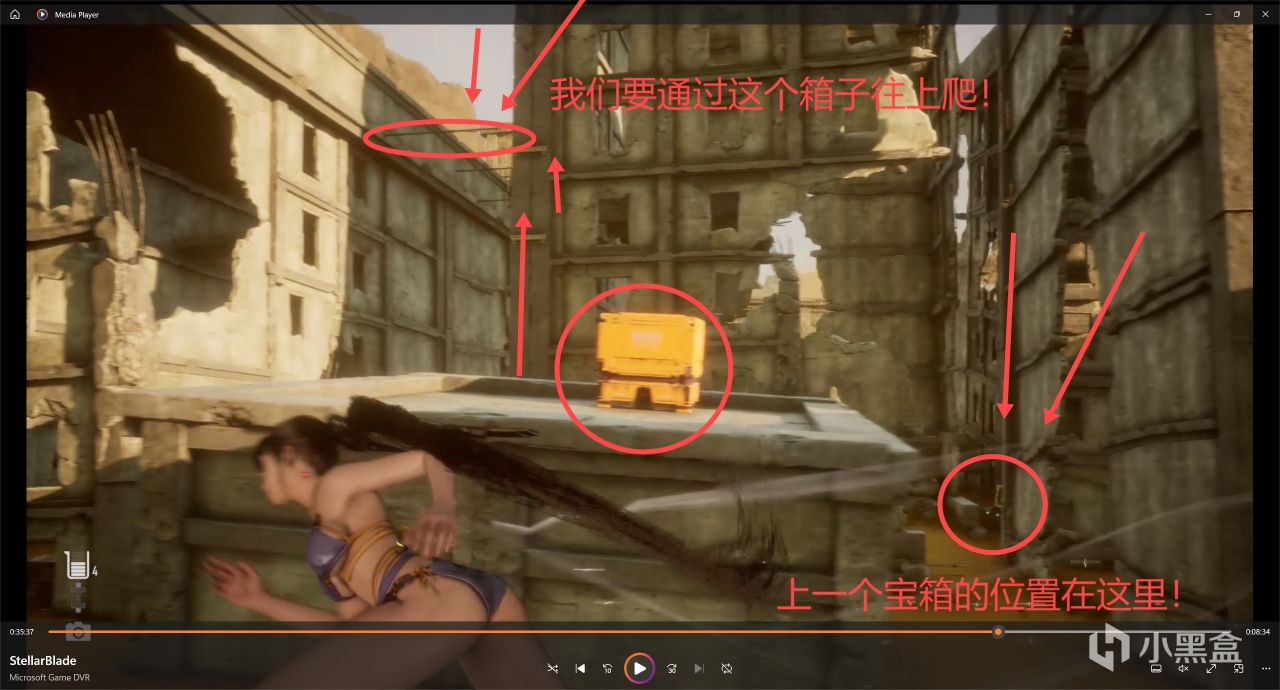 然後跳到樓梯上上去廢墟頂層,往後邊轉,可以看到好幾個箱子的角落裏面藏着一個寶箱
