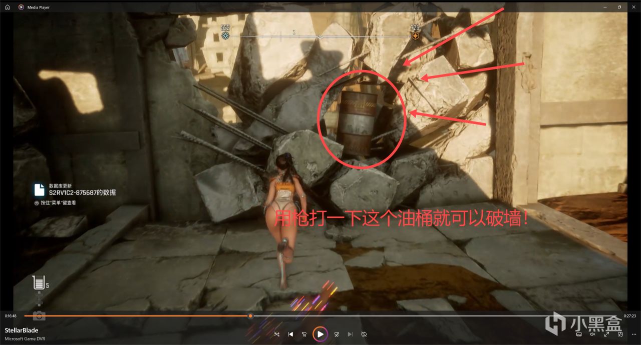 接着我們拿完以後數據庫以後,就在這個廢墟有一箇中間有一個油桶的牆,用槍打中間的油桶破牆進去!