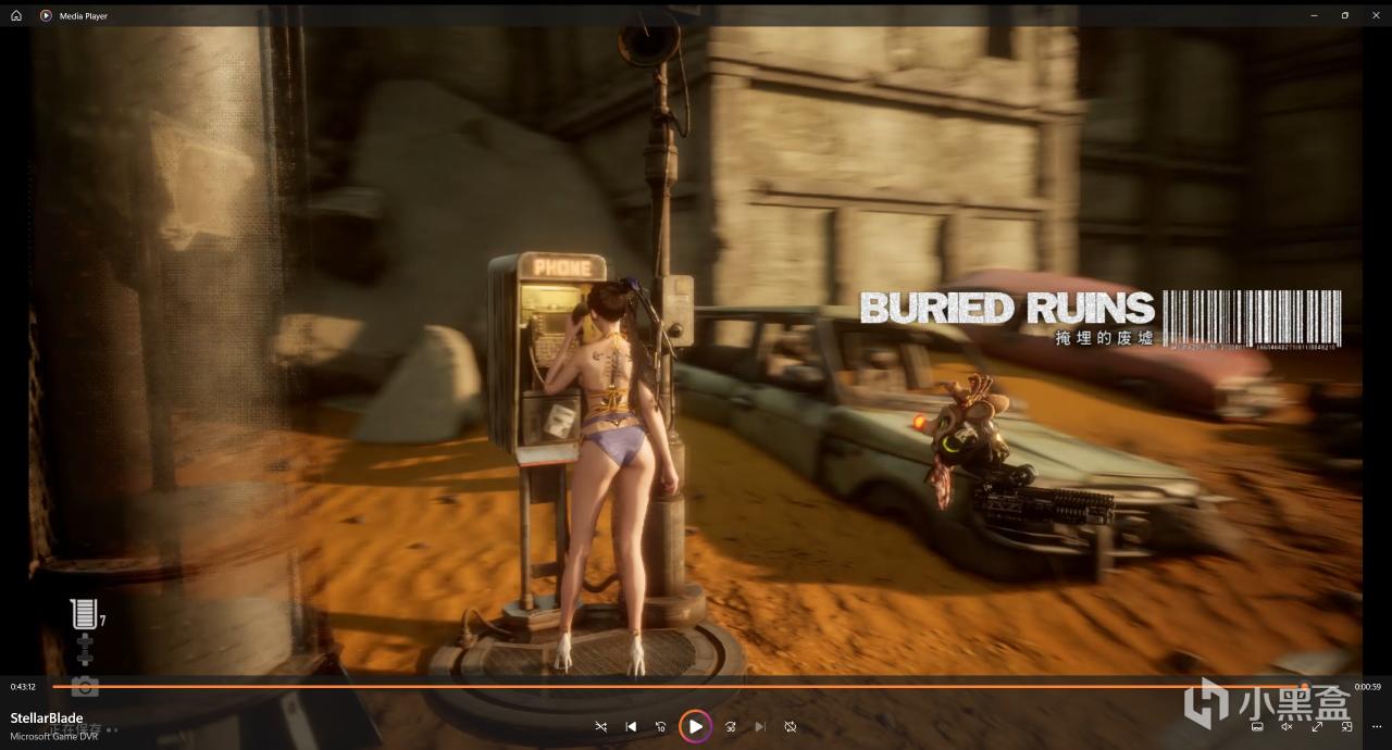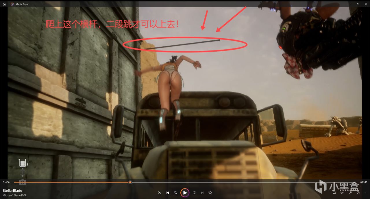 上去以後我們往前走就行,看到前面沒路了,有一個公交車的地方,我們需要把公交車左邊後輪那裏的油桶打爆,它就會滑下來,我們就可以過去了,過去以後在公交車旁邊就有一個寶箱!