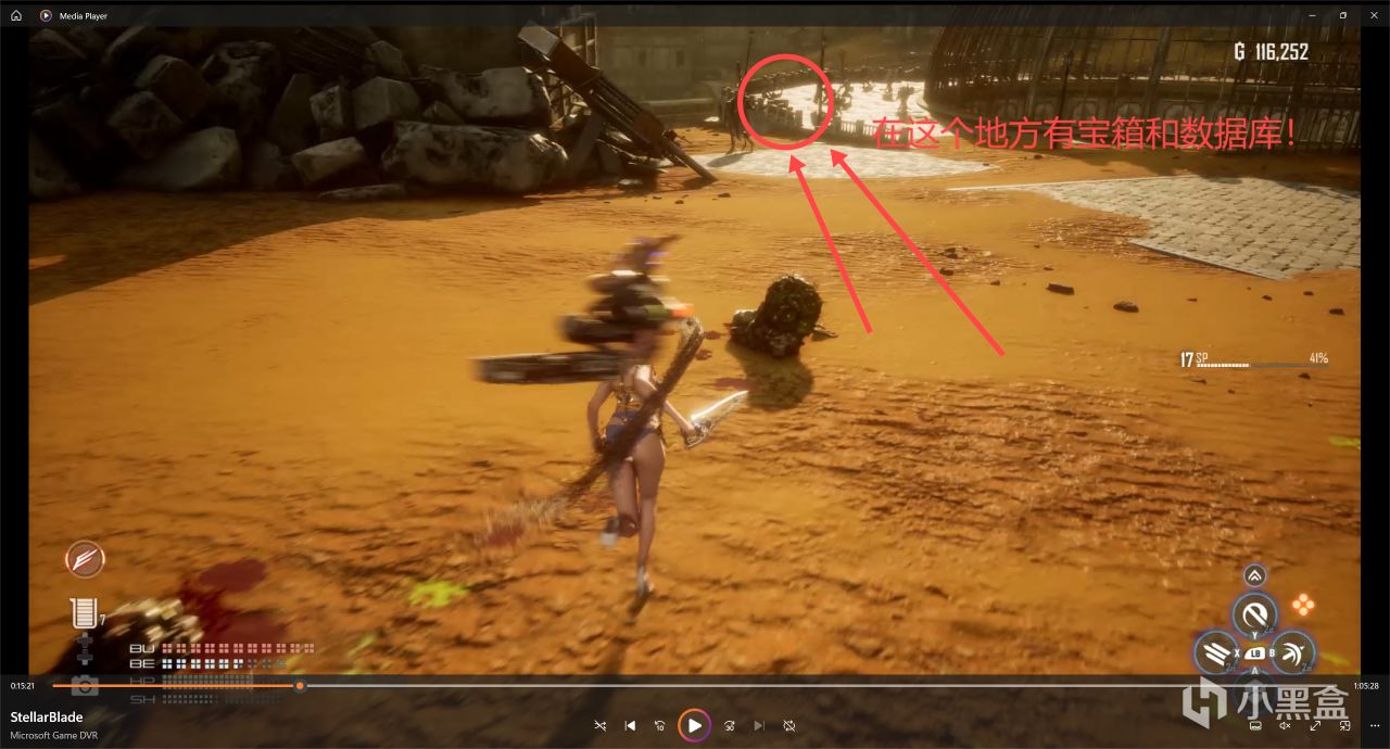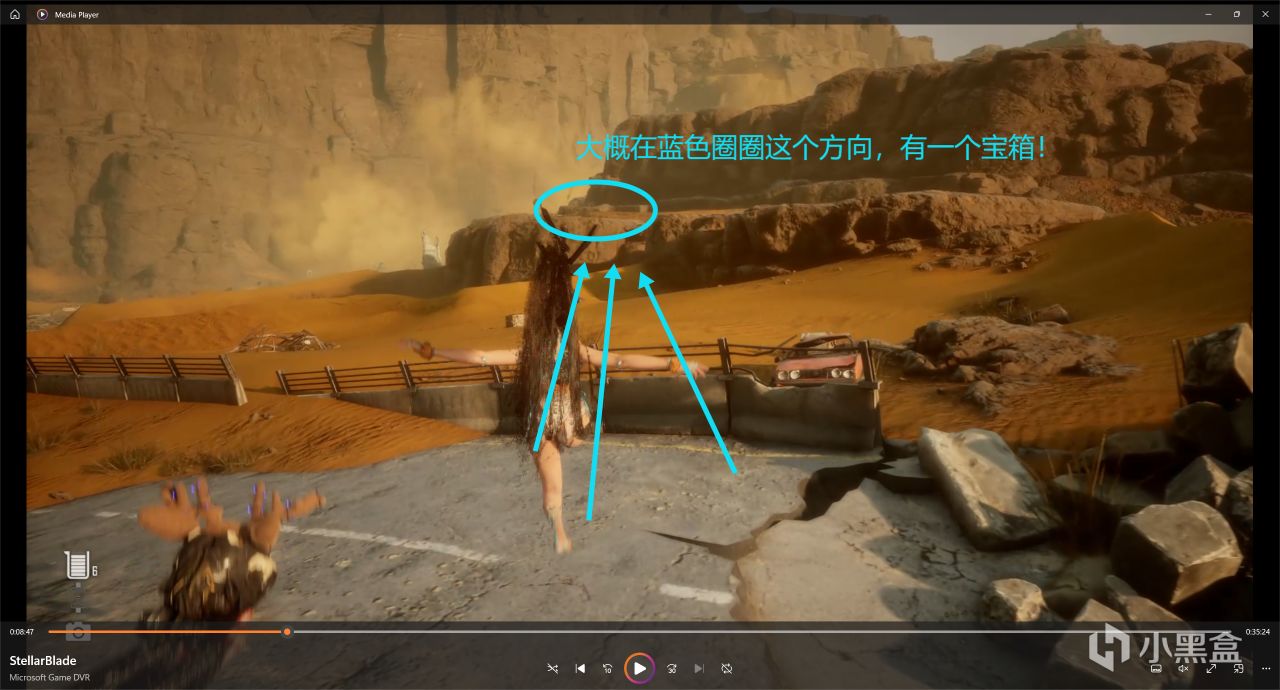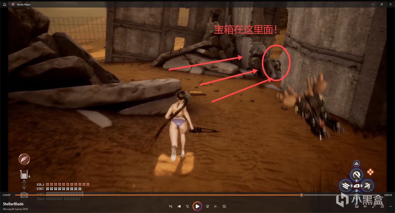 實際上我分析了一下地圖,你們可以直接來找我現在這個大箱子,更好找到寶箱,這一片廢墟就跟迷宮一樣。總之我就當你們大家很帥,已經找到上一個寶箱了哈,然後我們繼續往前走,參考下圖寶箱的位置和我所在的方位!