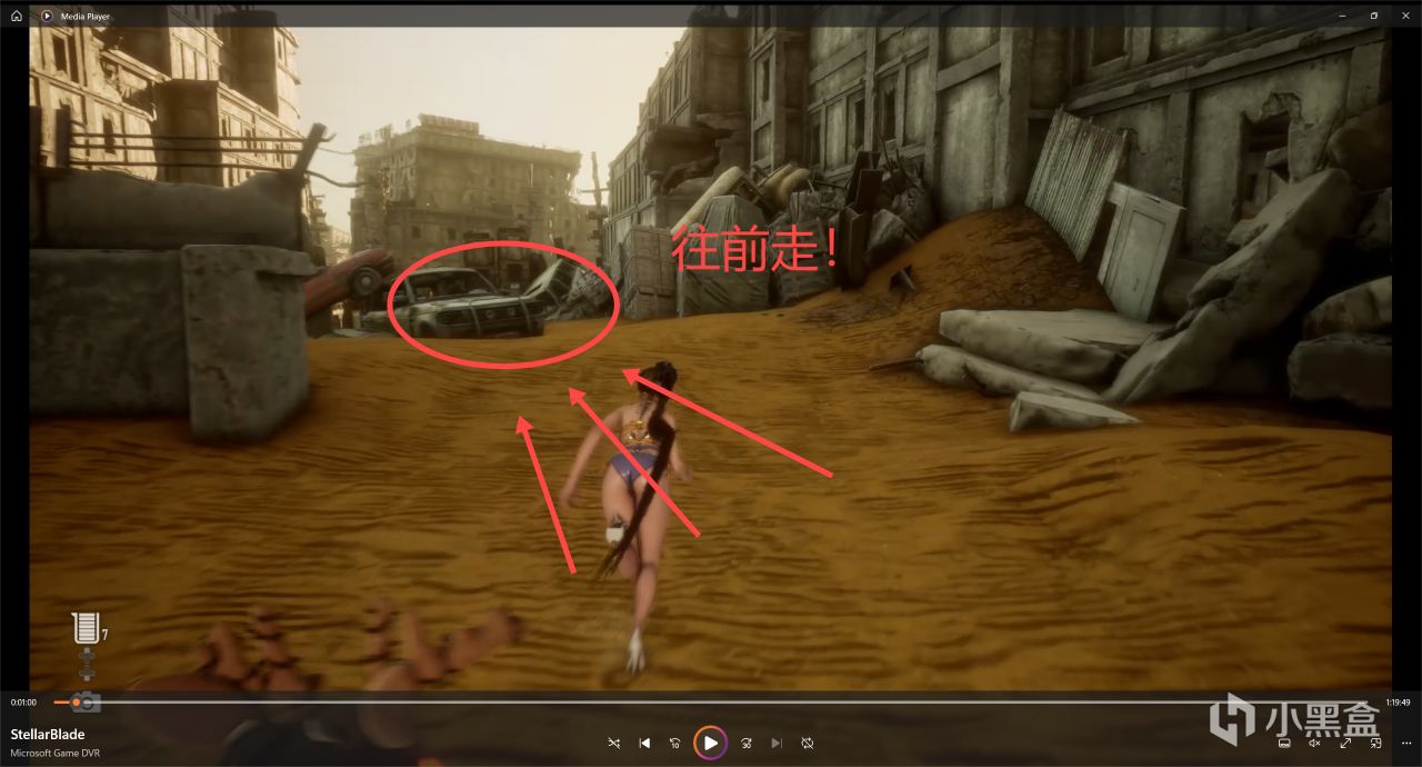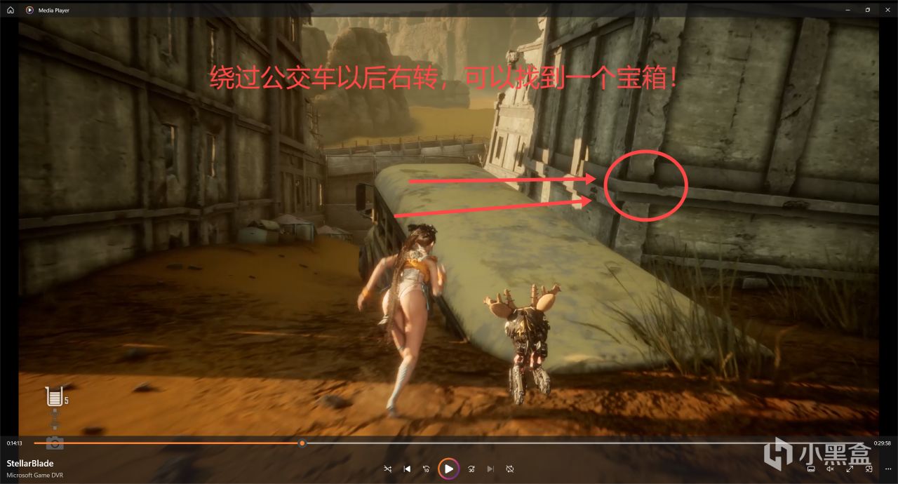 我們朝着前面的公交車那邊去,公交車後面右轉,可以在角落裏面拿到一個寶箱!
