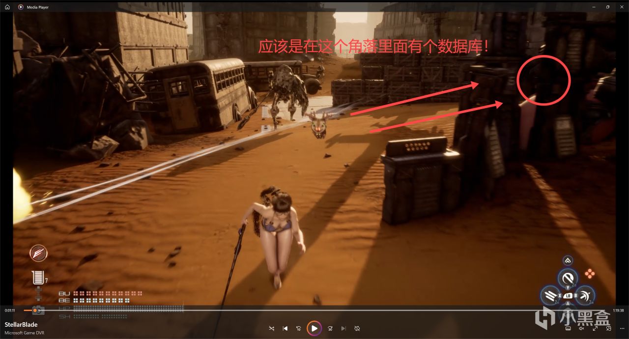 破牆以後出門往左邊看,圖中左邊圈圈藍色箱子上面是數據庫《真相》第4篇,右邊是一個營地補給點。拿完數據庫我們就去旁邊的營地補一下狀態!