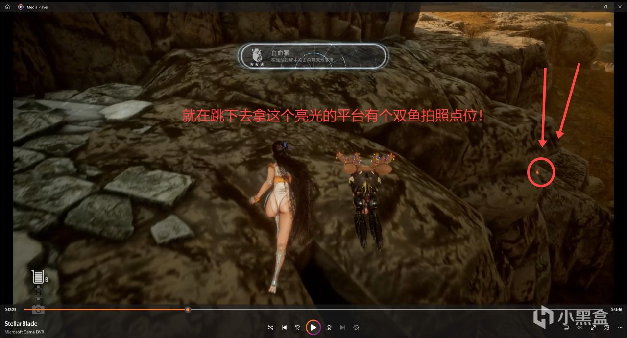 拿完上面的寶箱以後別急着就走了哈,在一個非常隱蔽的地方有一個雙魚的拍照點位,就在寶箱很近往回走一丟丟的下面平臺,注意一下紅色亮光物品的地方!