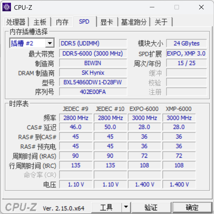 看了一圈之后选了佰维的DW100时空行者 的 24Gx2 6000C28,价格便宜颜值也不错,根据各方了解到的情报,这套内存的颗粒应该就是海力士最新的M die 3GB单颗的颗粒了。因为我马上想换个小吹雪B850的主板,正好内存买白色可以和主板搭配,还有RGB,对我来说基本就是完美的选择了。