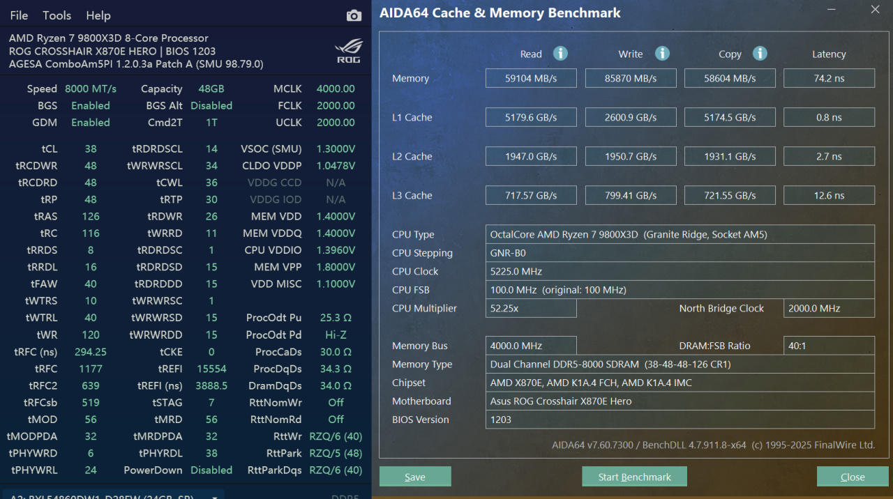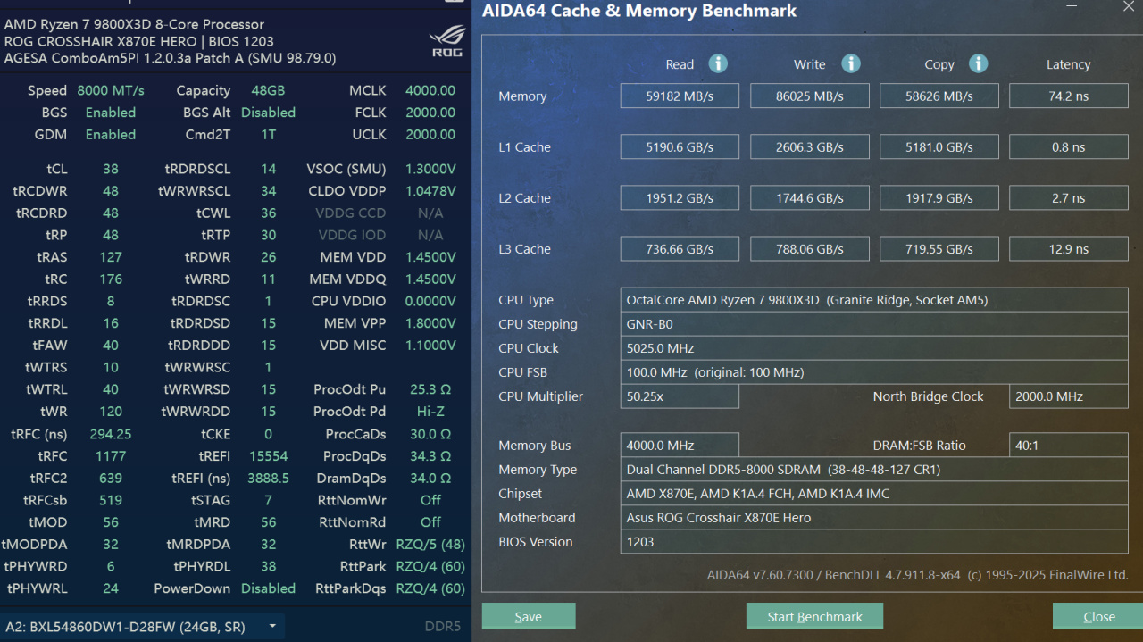 下面就简单测试一下,测试平台是我的Crosshair X870E Hero,CPU用的是9800X3D。一般Zen5是只需要同步的6000MHz就能发挥出99%性能,而且BW100时空行者这一台内存也是专为AMD做了EXPO优化,所以这里也选AMD平台旗舰来做测试了