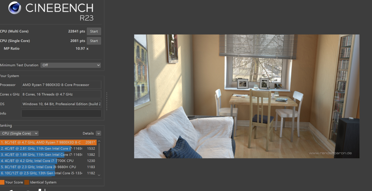 经过简单优化过后,8000MHz靠后的小参可以简单优化一些,不过对性能的影响不大。简单测试一下CinebenchR23,有了新内存之后性能稍微提升,不过容量是这次的主要升级目的,优化参数体验不错即可