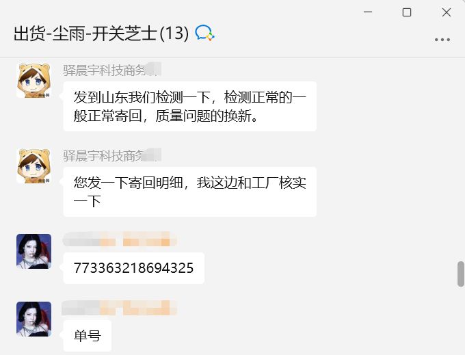 但是壞掉的電源我們要找工廠對接處理,這一步基本上跟個人買家是一致的,都是聯繫客服。只不過我是微信聯繫,大體流程就是我把舊的電源發給玄武檢測,如果可以復現故障,直接換新,郵費各付各的