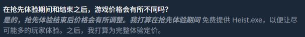 根據開發者自述,遊戲於 搶先體驗階段 免費,待正式版本發佈後將轉爲收費制。