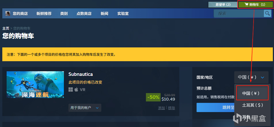 2⃣ 打開 Steam 添加任意商品至購物車,在購物車頁面更改爲土區即可。