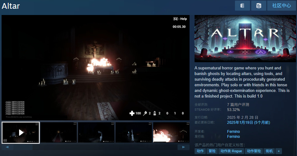 《Altar》是一款超自然恐怖遊戲,你需要在程序生成的場景中尋找祭壇、利用工具、躲避致命攻擊,並最終驅逐邪靈,支持單人或聯機合作。