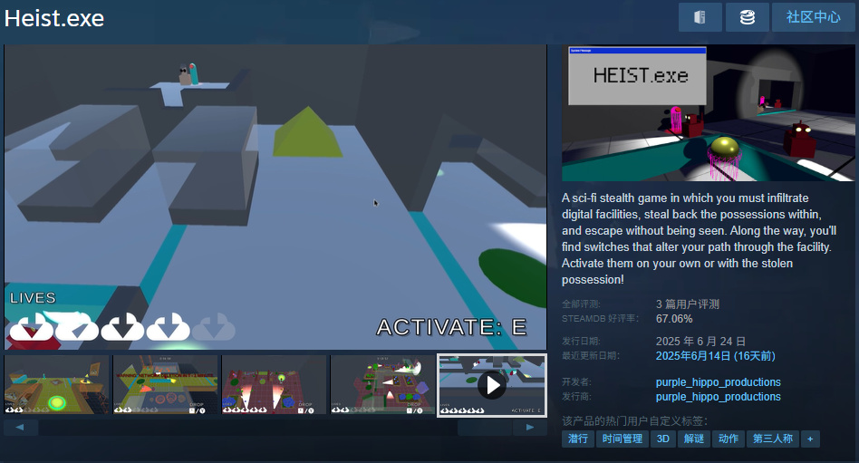 《Heist.exe》是一款科幻題材的潛行遊戲。你將潛入數字設施中,偷取重要物品並悄悄逃脫。途中你會遇到可切換路徑的機關開關,使用偷來的物品即可激活。