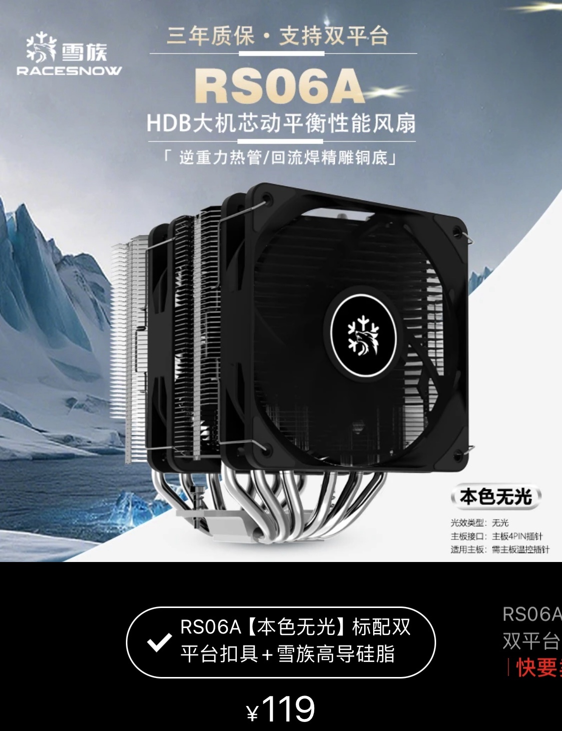 雪族rs06a 119元 双12cm风扇双塔六热管镀镍底座 推荐使用cpu:14600kf/245k/5700x/7700/9700x