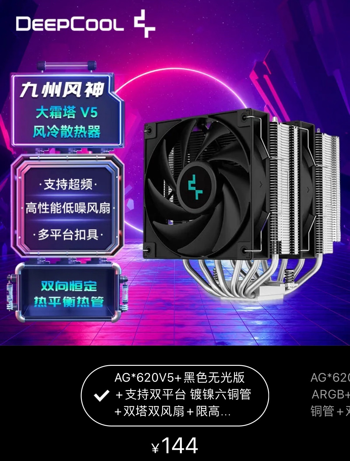 九州风神大霜塔 144元 双12cm风扇双塔六热管镀镍底座 推荐使用cpu:12600kf/245k/5700x/7700/9700x