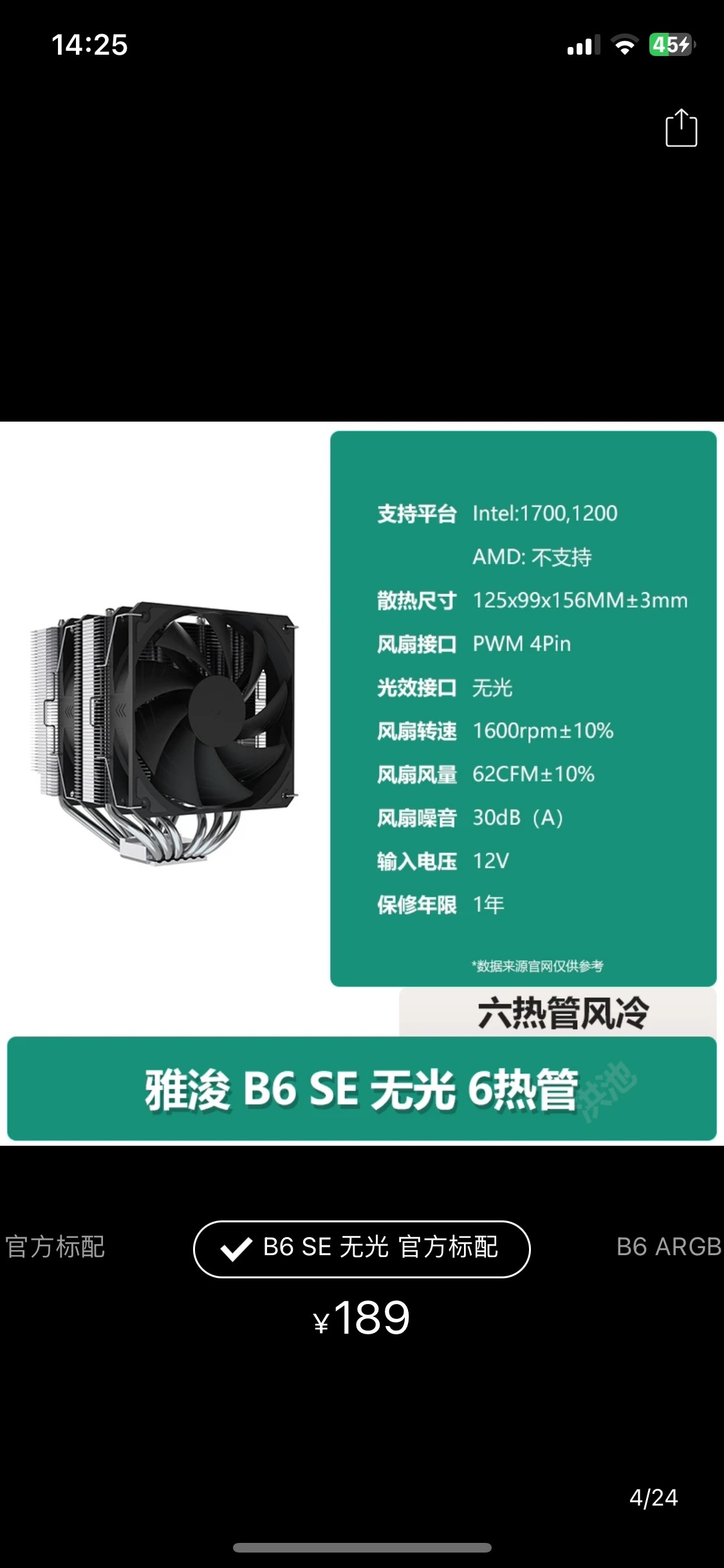 雅俊b6se 179元 双12cm风扇双塔六热管直触 推荐使用cpu:14600kf/245k