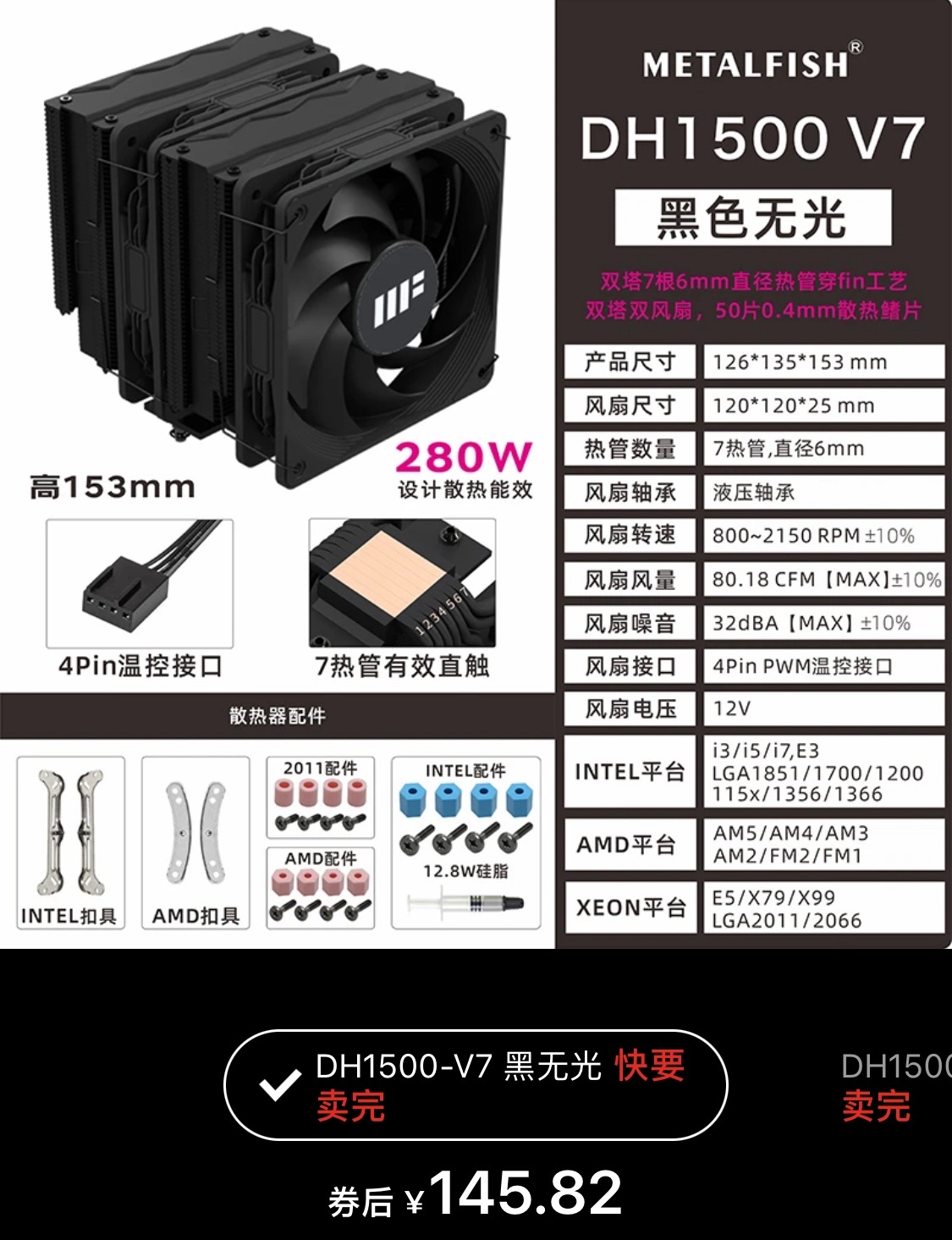 鱼巢dh1500v7 145元 双12cm风扇双塔七热管直触 推荐使用cpu:12600kf/245k/5700x/7700/9700x
