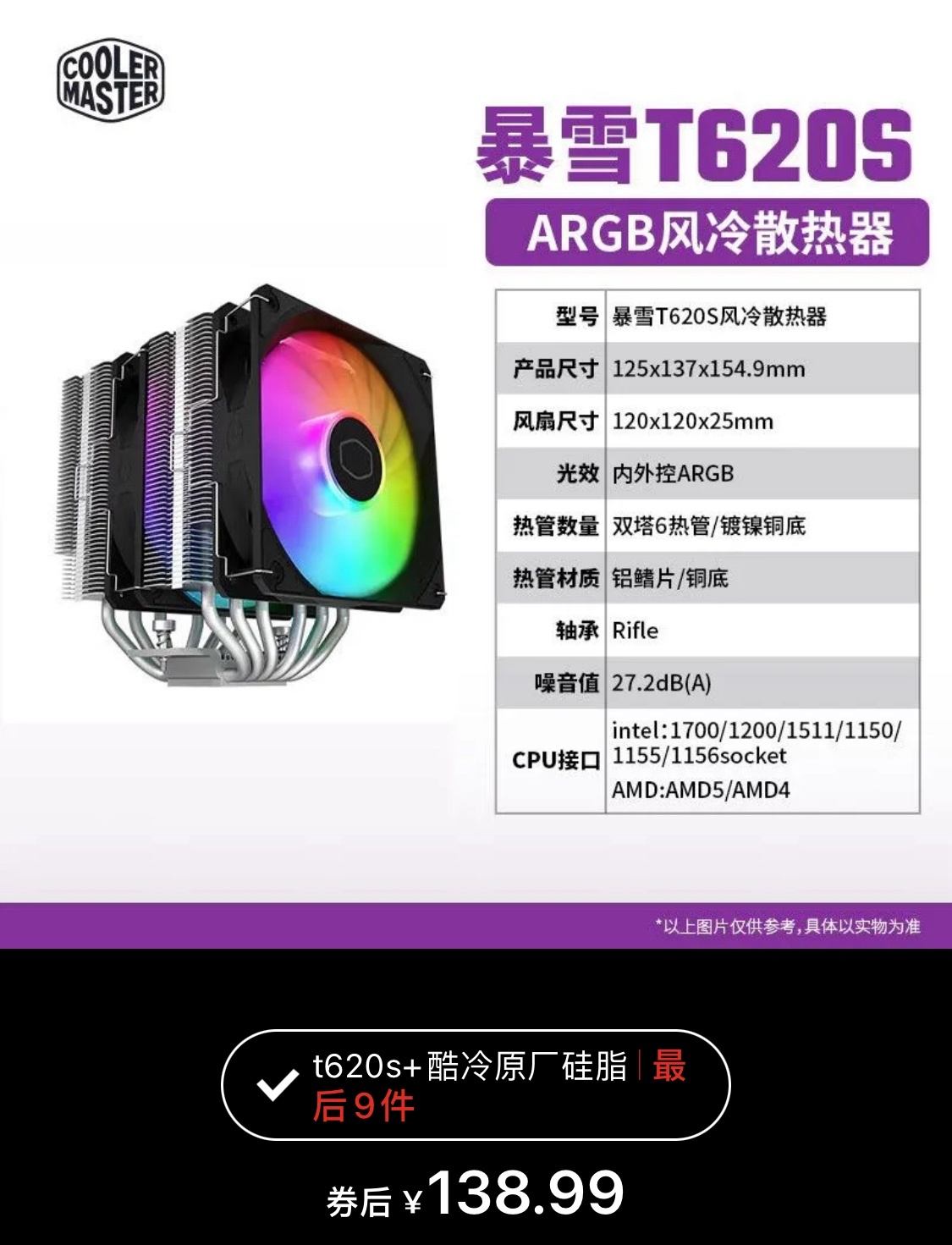 酷冷至尊t620s 138元 双12cm风扇双塔六热管镀镍底座 推荐使用cpu:12600kf/245k/5700x/7700/9700x