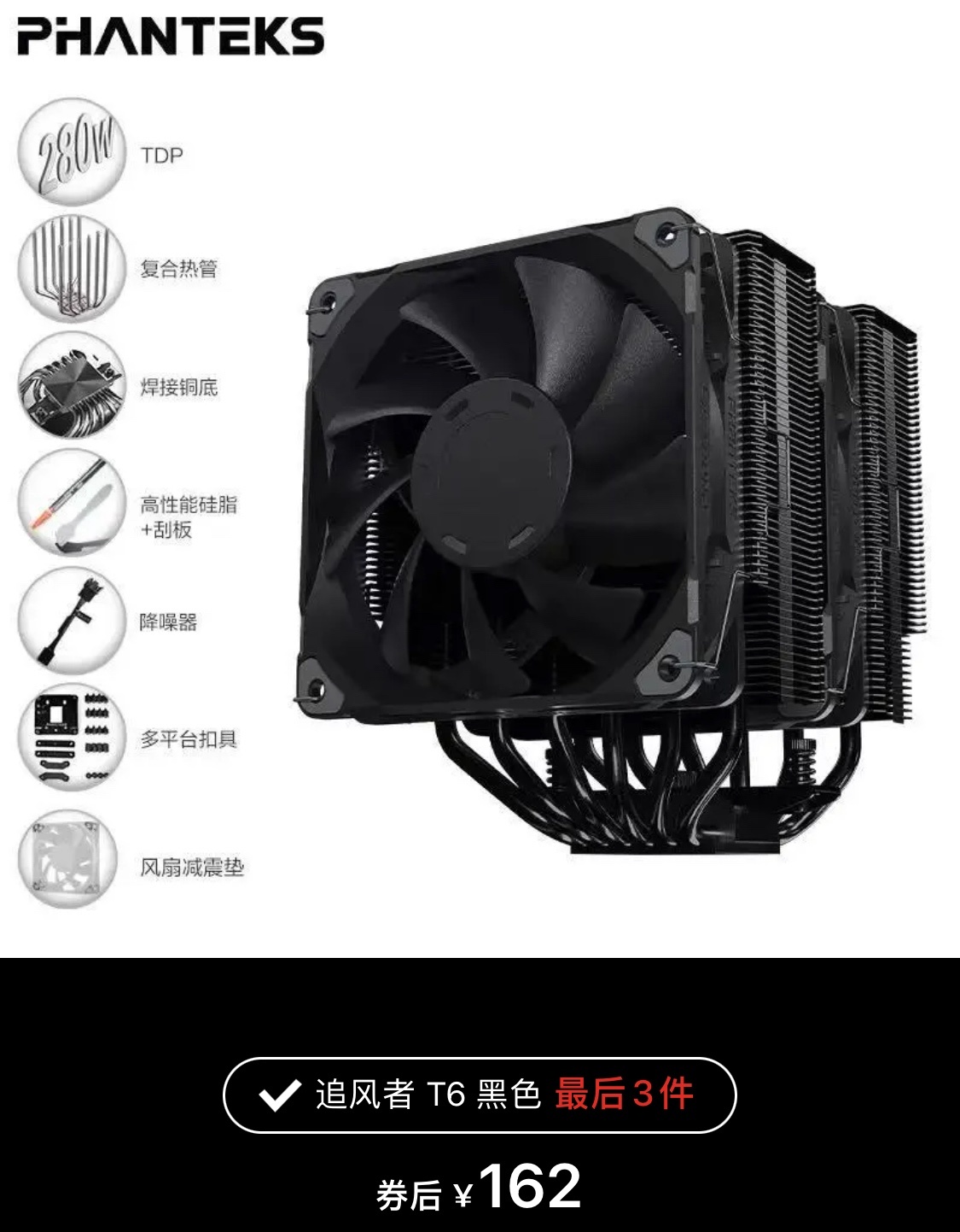 追风者t6 162元 双12cm风扇双塔六热管镀镍底座 推荐使用cpu:14600kf/245k/5700x/7700/9700x