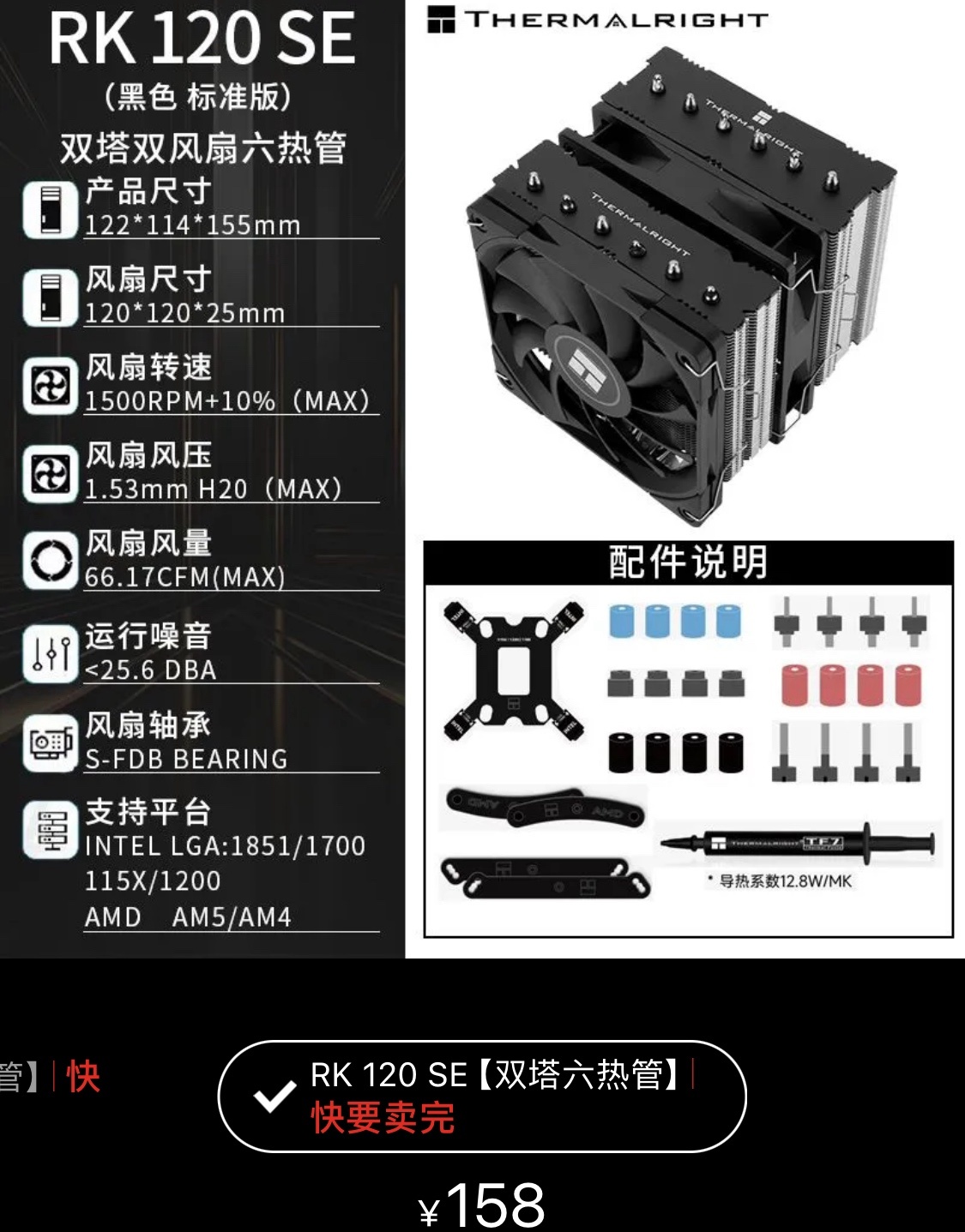 利民rk120se 158元 双12cm风扇双塔六热管镀镍底座 避让内存 推荐使用cpu:12600kf/245k/5700x/7700/9700x